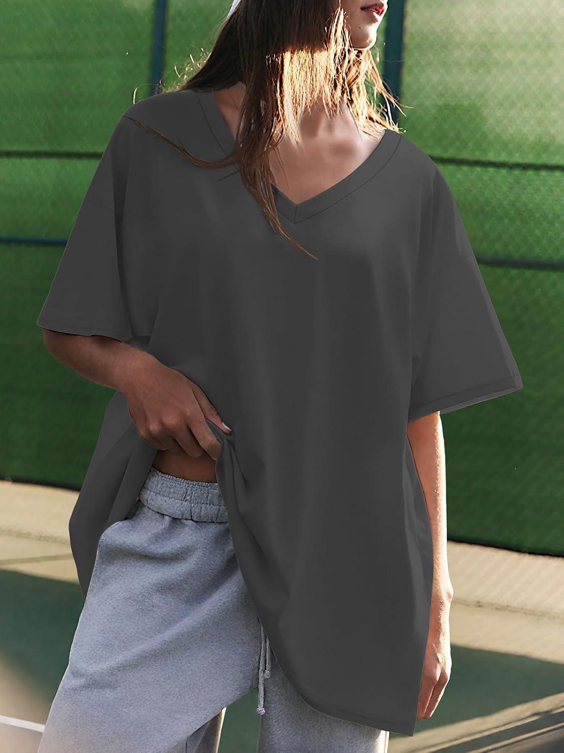 ATHMILE Womens Oversized Shirts V Neck Plus Size Spring Workout Summer Tops Beach Vacation 2026 Gym Clothes Basic Tee(Dark Gray)