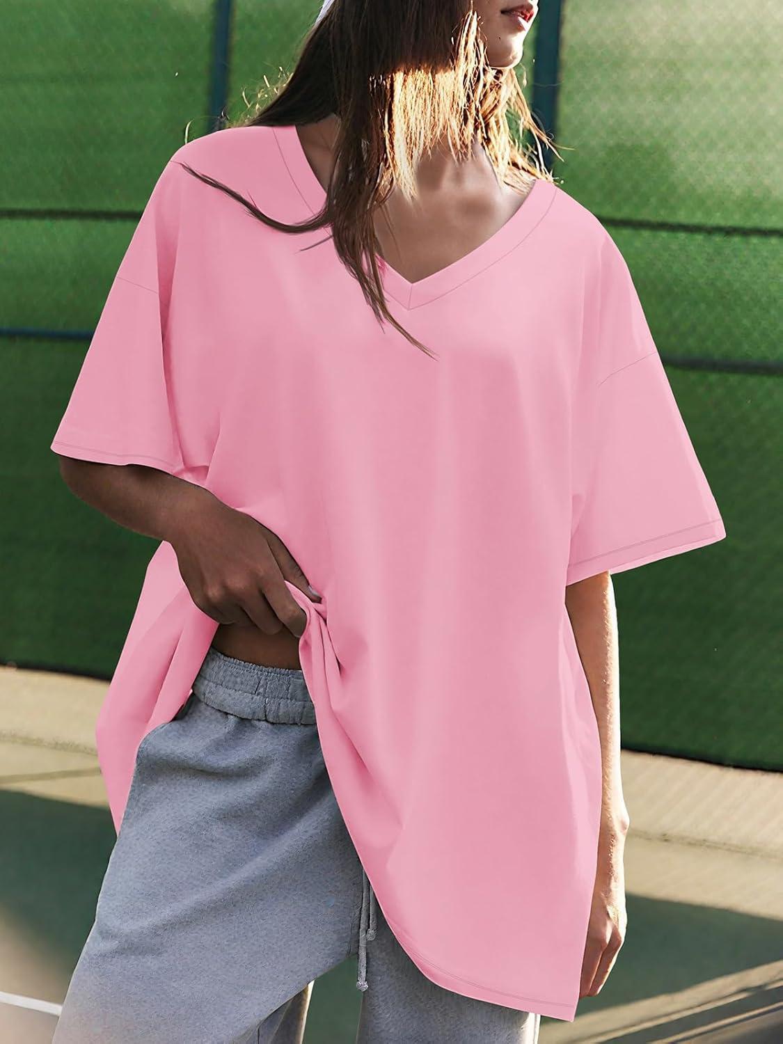 ATHMILE Womens Oversized Shirts V Neck Plus Size Spring Workout Summer Tops Beach Vacation 2026 Gym Clothes Basic Tee(Pink)