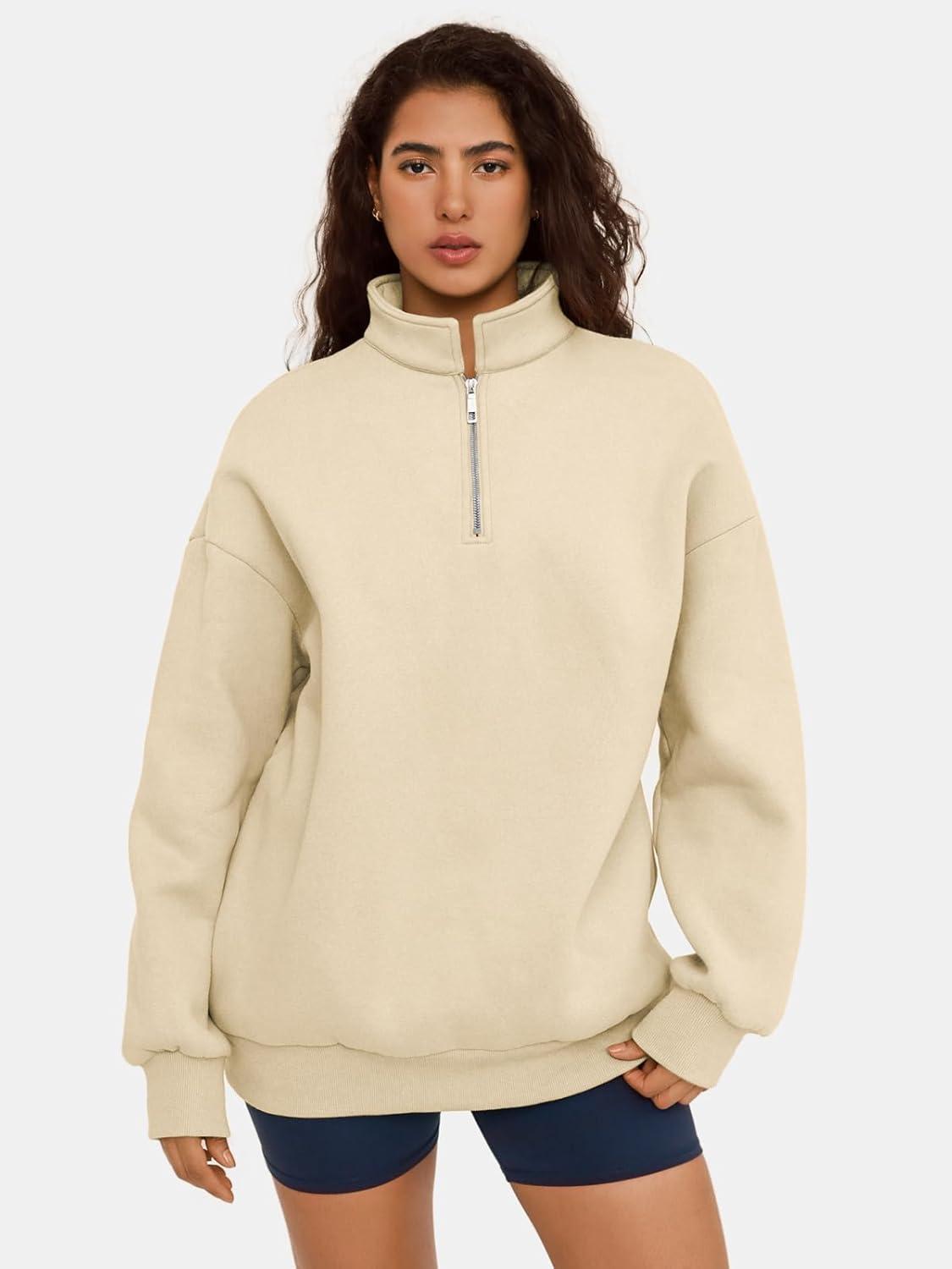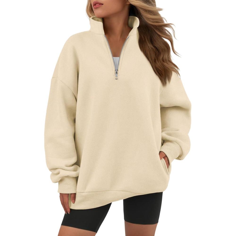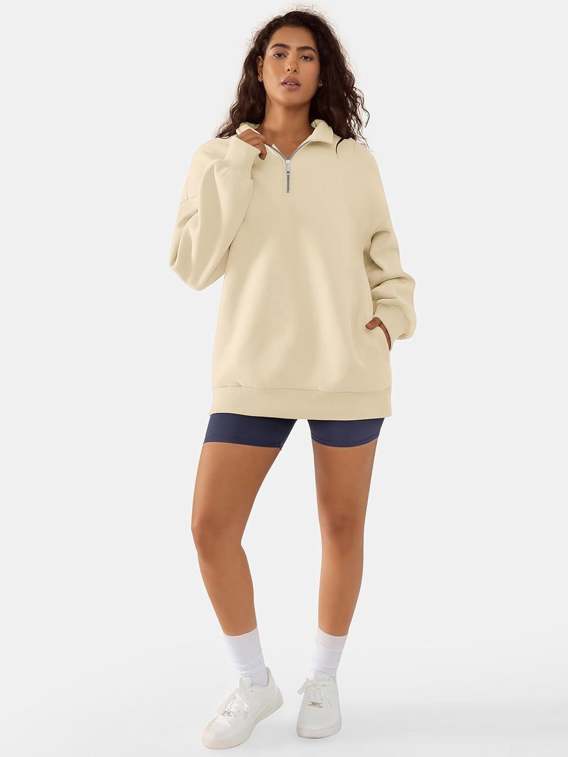ATHMILE Womens Oversized Sweatshirts Fall Fashion Hoodies Half Zip Fleece Pullover Long Sleeve Y2K Clothes with Side Pockets(Apricot)