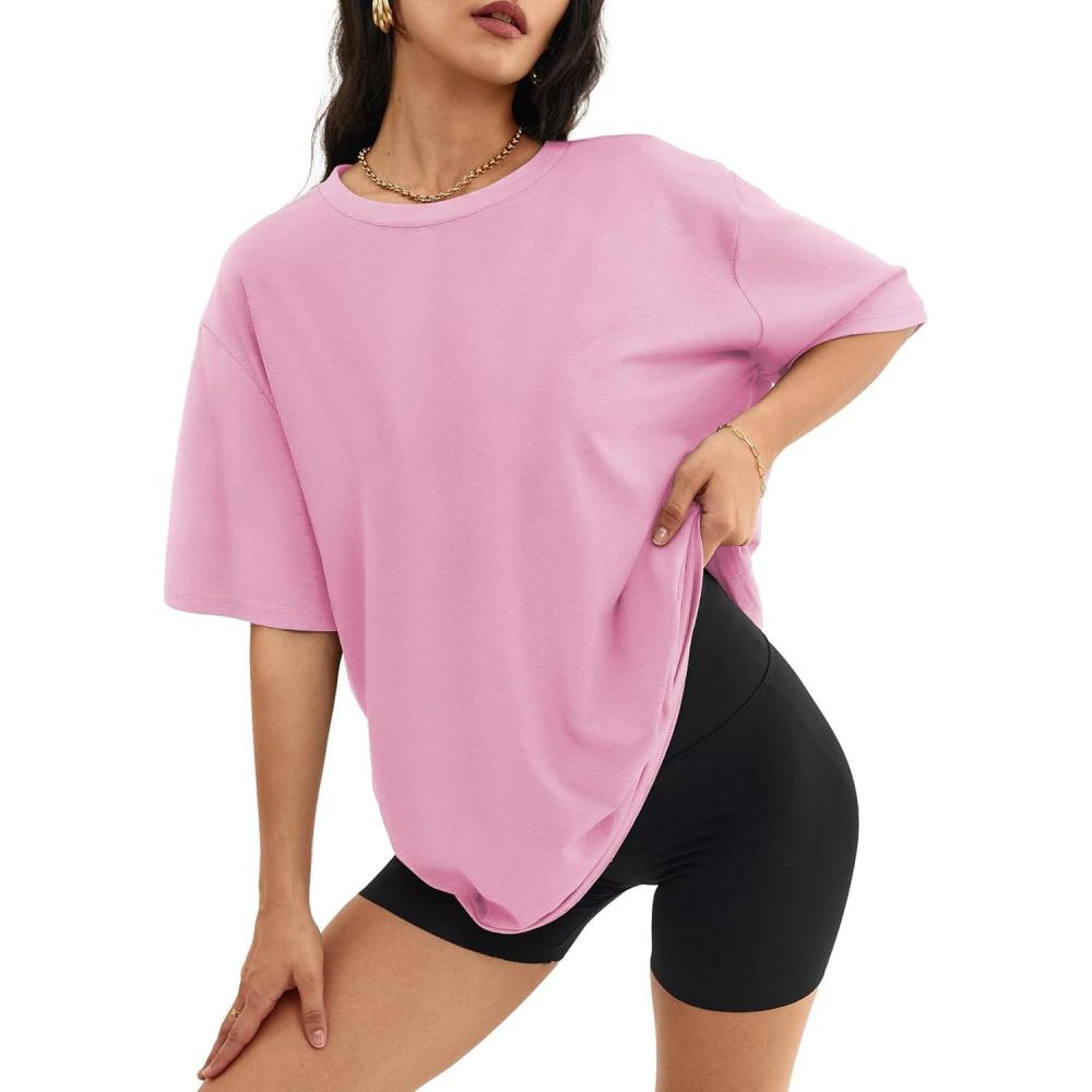 ATHMILE Womens Oversized T Shirts Loose Fit Crewneck Short Sleeve Tops Summer Casual Blouse Y2K 2025 Basic Tee Beach(Pink)
