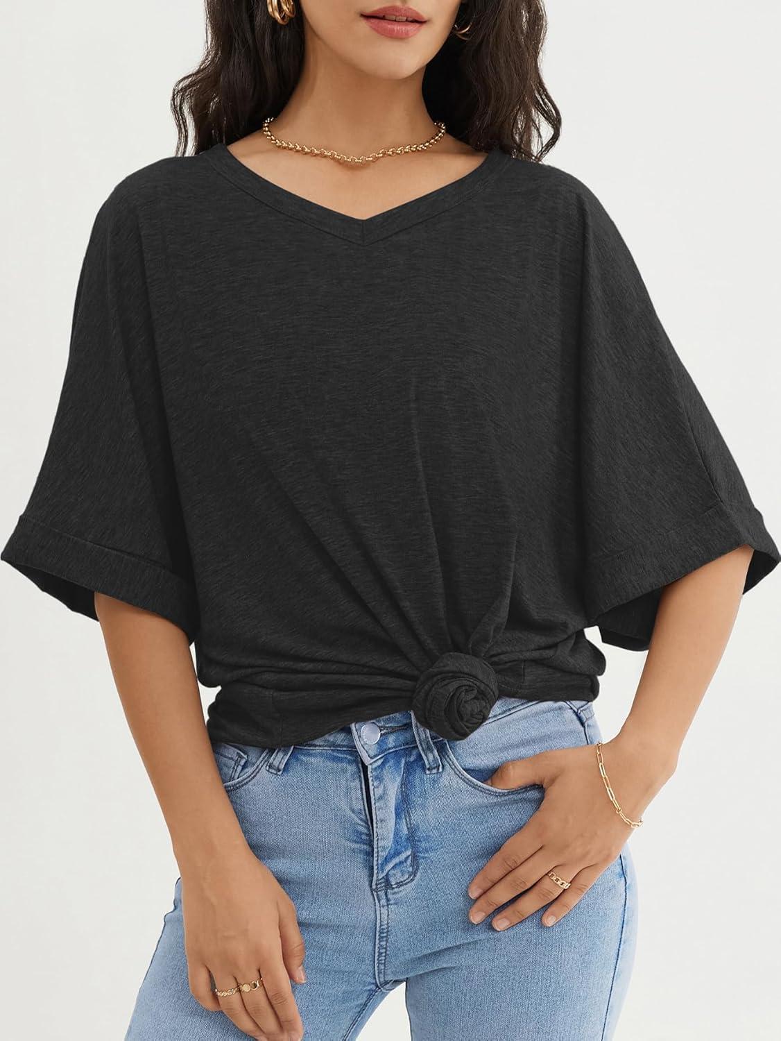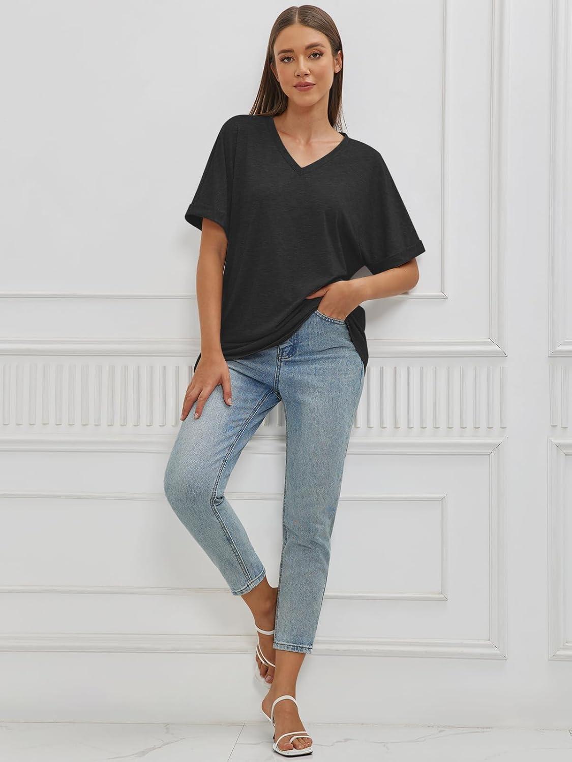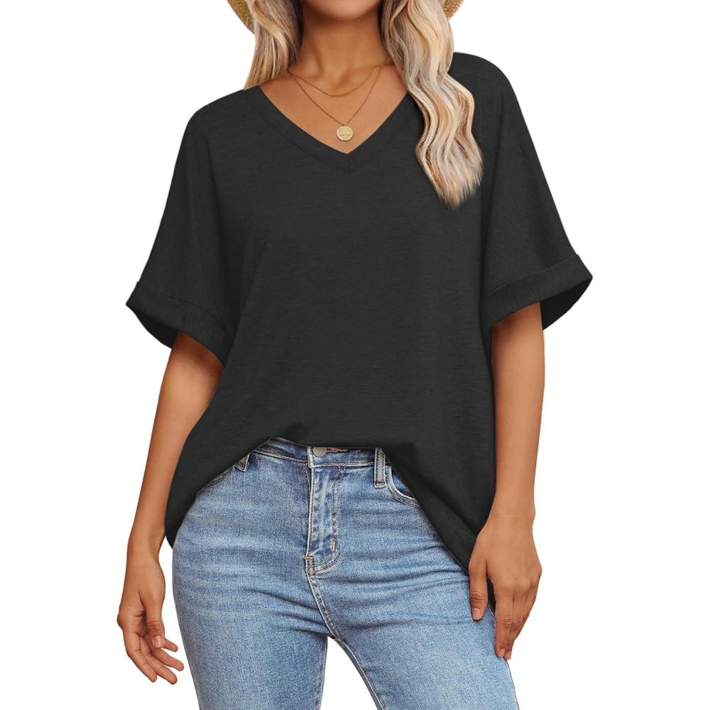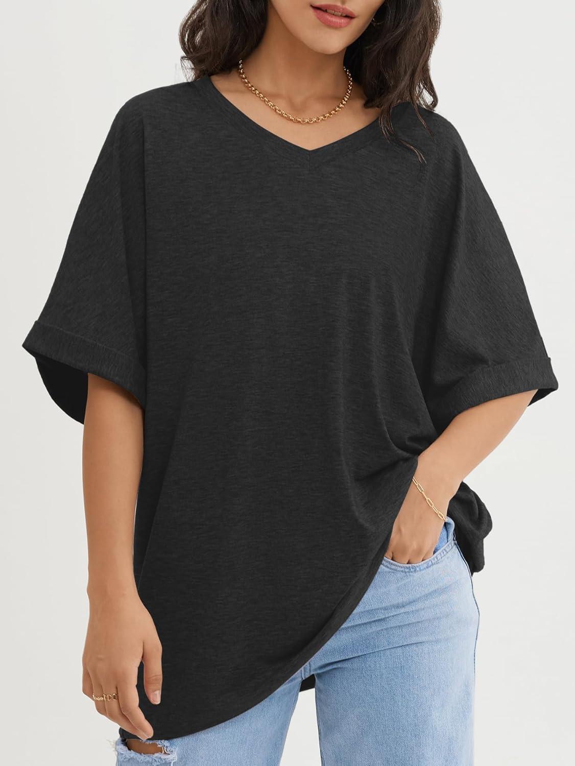 ATHMILE Womens Oversized T Shirts Loose Fit V Neck Short Sleeve Summer Casual Blouse 2025 Y2K Tee Tops(Black)