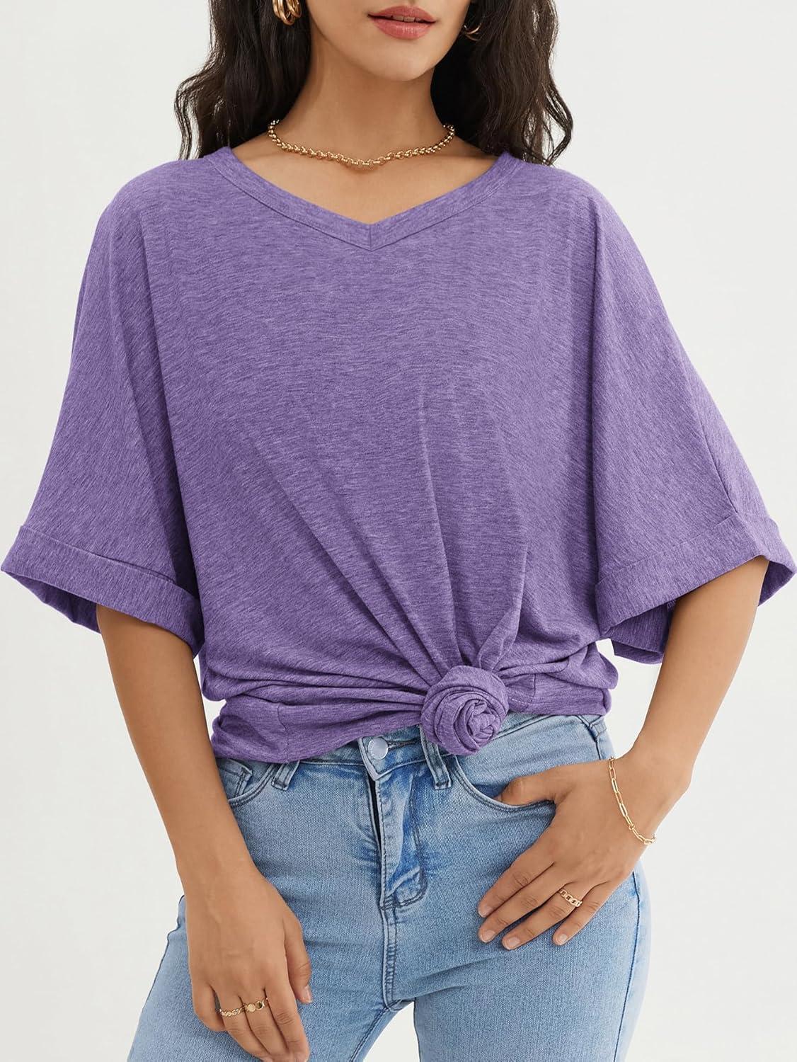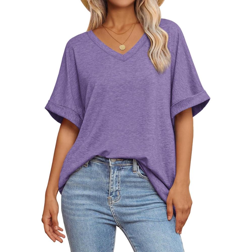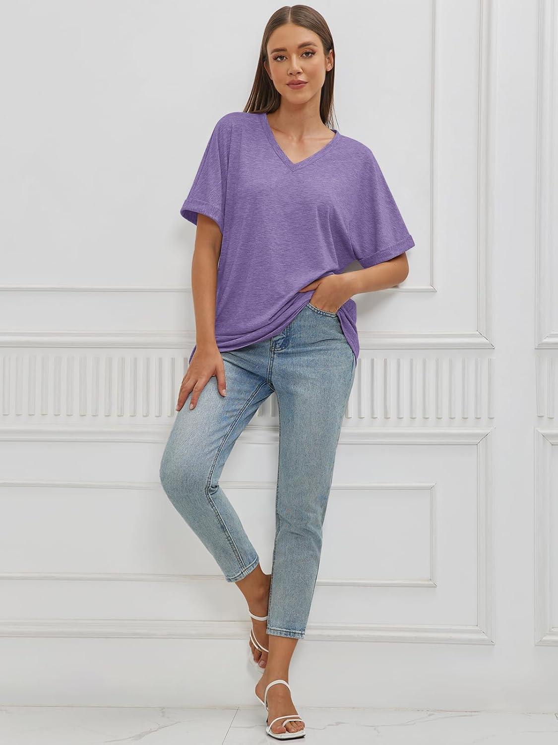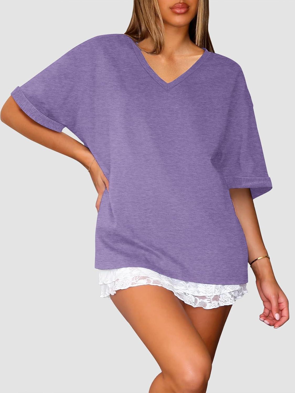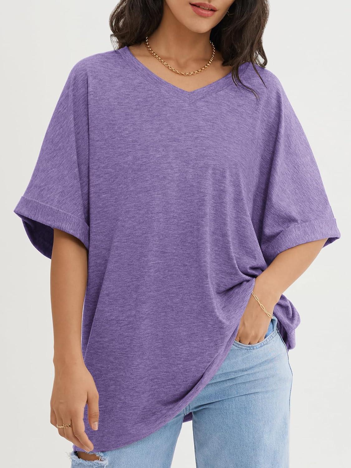 ATHMILE Womens Oversized T Shirts Loose Fit V Neck Short Sleeve Summer Casual Blouse 2025 Y2K Tee Tops(Purple)