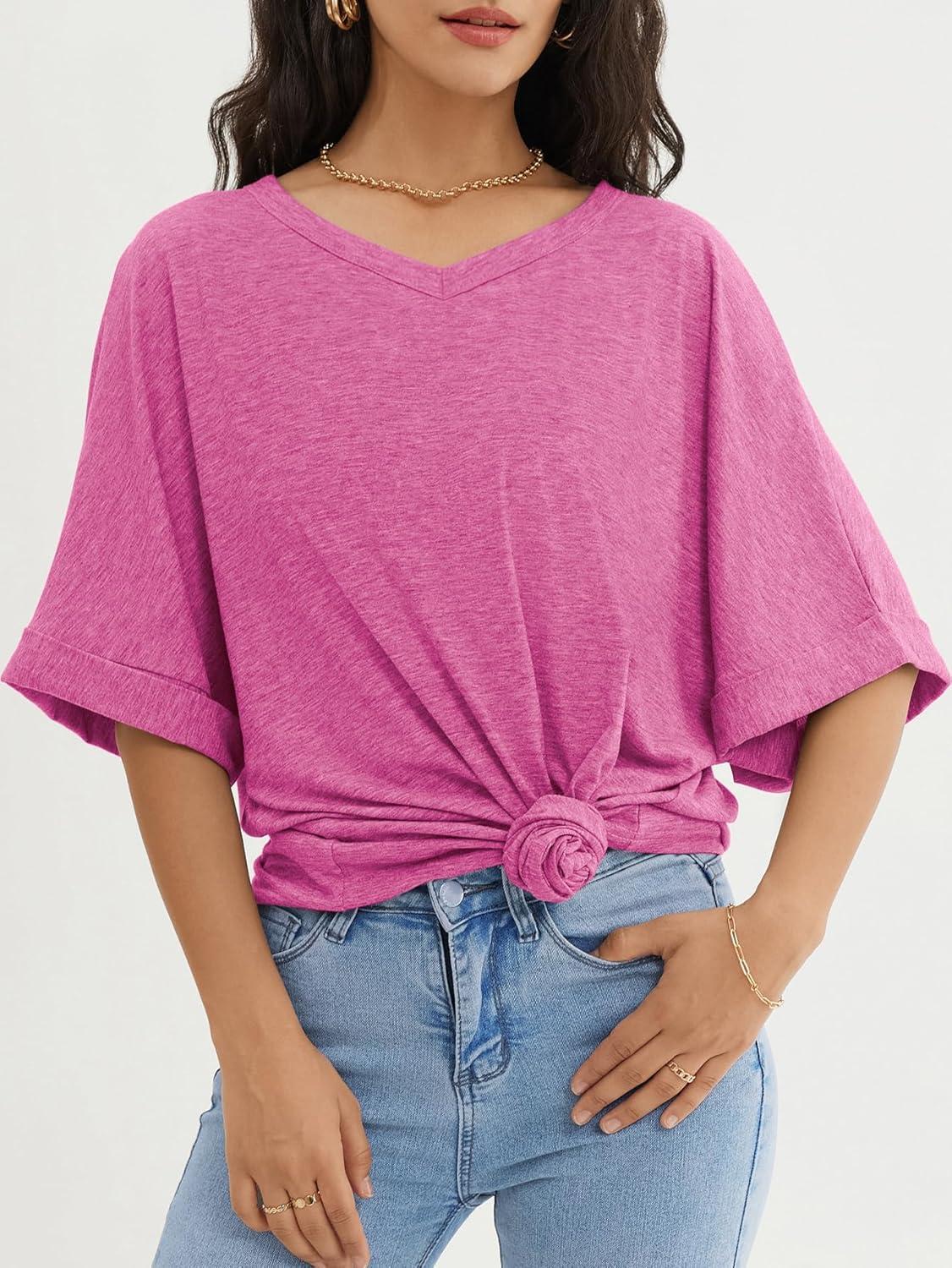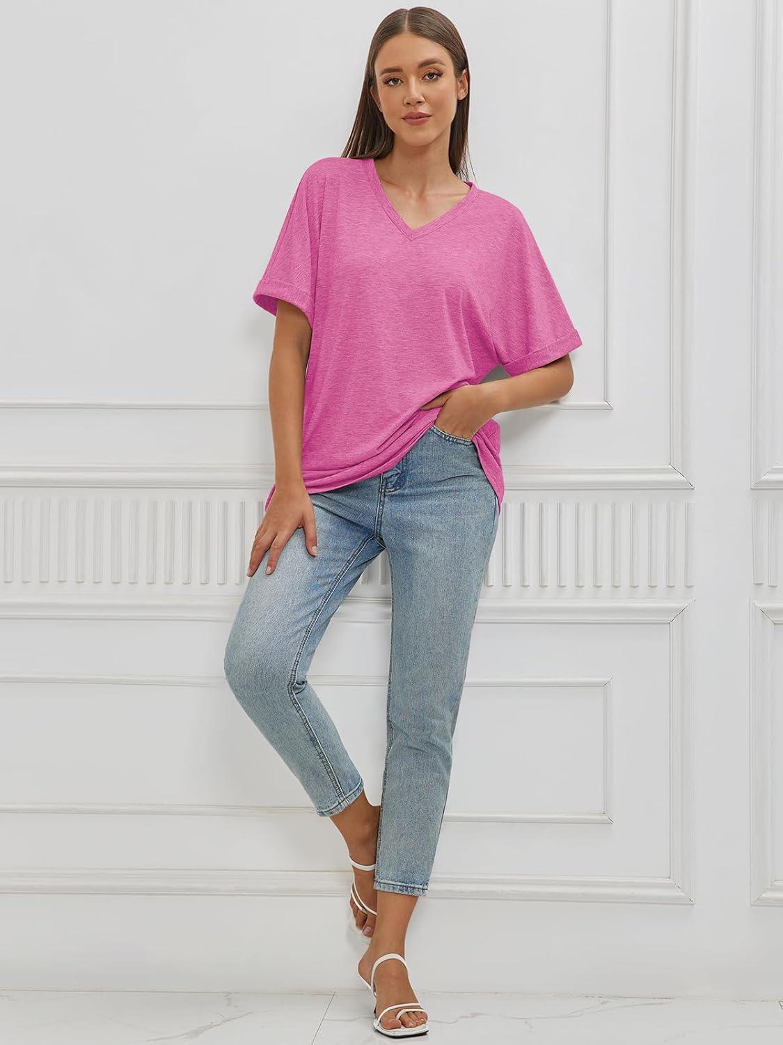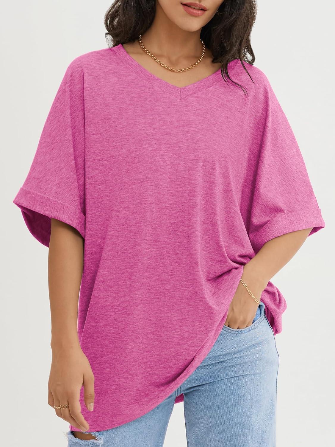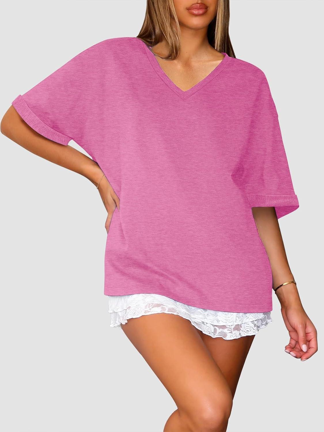 ATHMILE Womens Oversized T Shirts Loose Fit V Neck Short Sleeve Summer Casual Blouse 2025 Y2K Tee Tops(Rose)