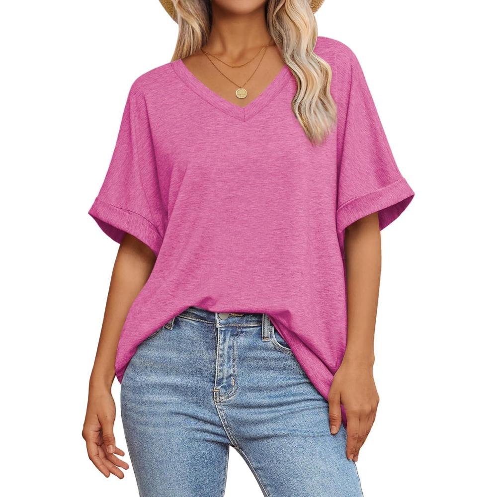 imageATHMILE Womens Oversized T Shirts Loose Fit V Neck Short Sleeve Summer Casual Blouse 2025 Y2K Tee TopsRose