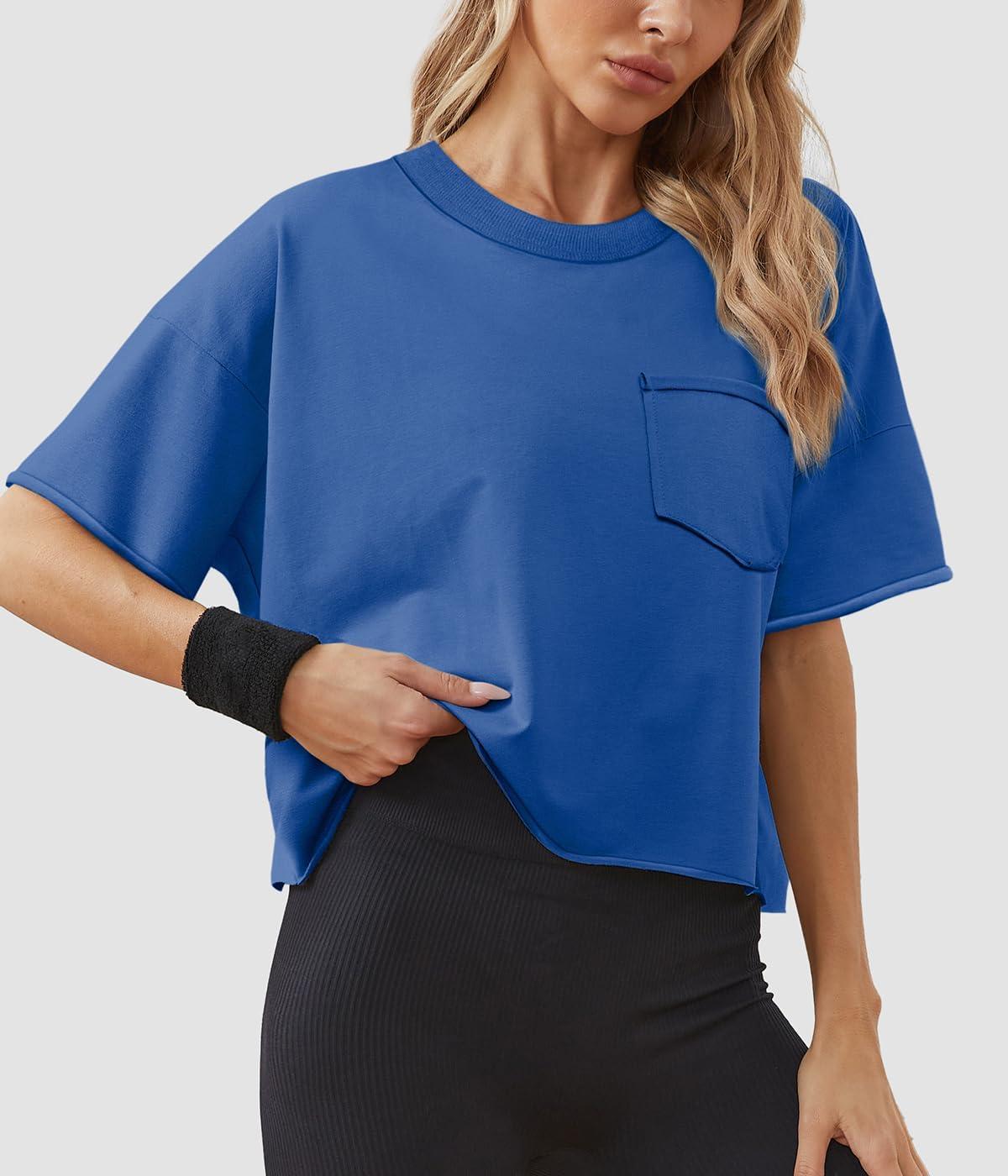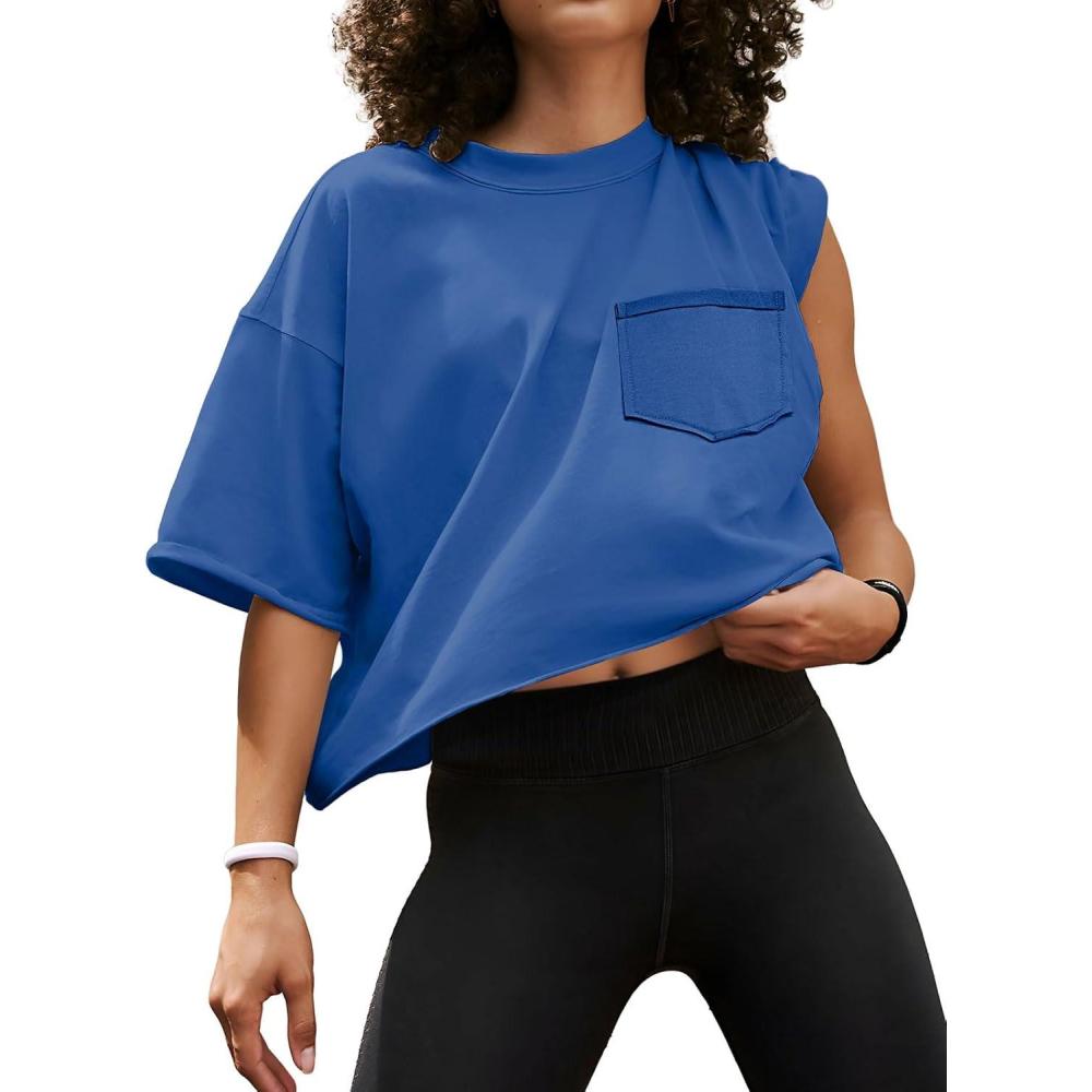 ATHMILE Womens Oversized T-Shirts Short Sleeve Workout Crop Tops Casual Drop Shoulder Boxy Roll Hem Basic Loose Tees(Blue)