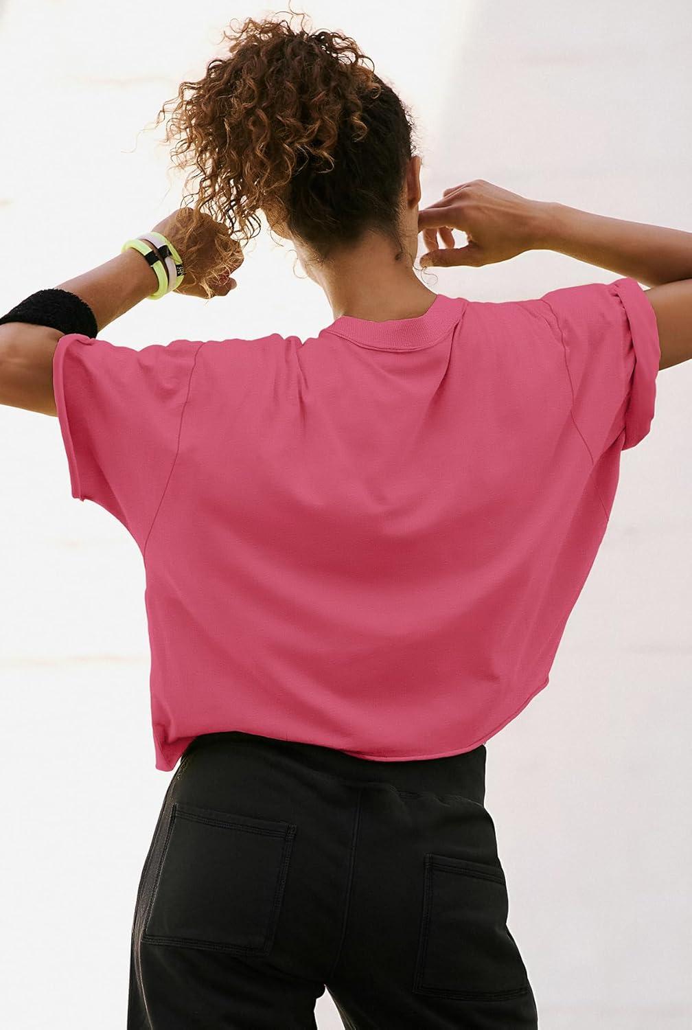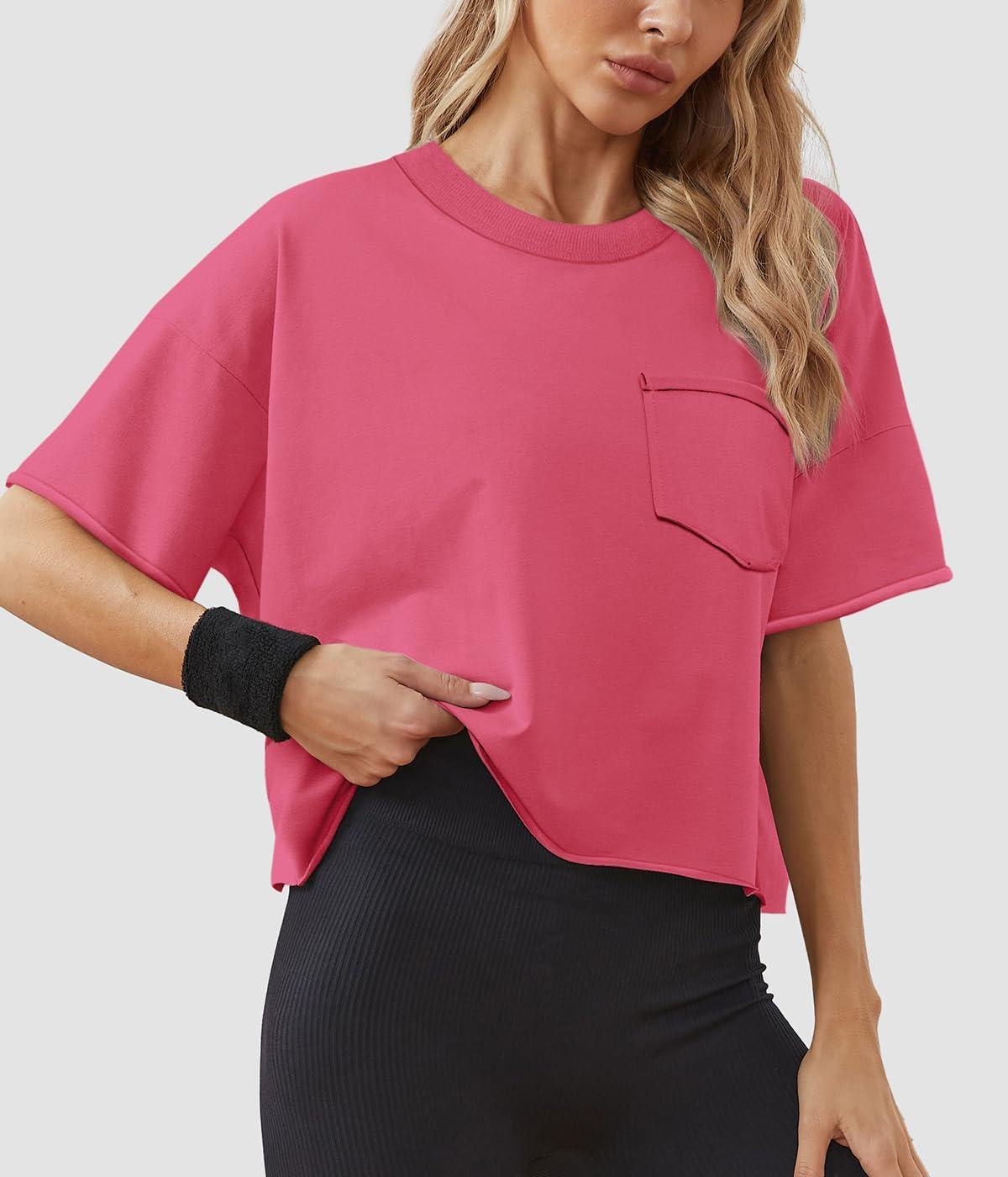 ATHMILE Womens Oversized T-Shirts Short Sleeve Workout Crop Tops Casual Drop Shoulder Boxy Roll Hem Basic Loose Tees(Hotpink)