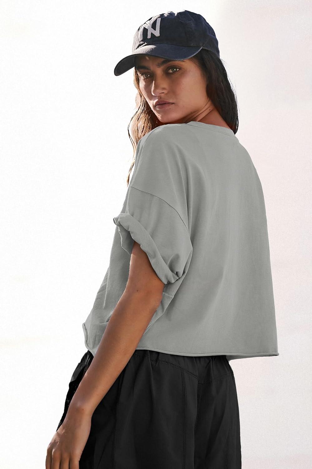 ATHMILE Womens Oversized T-Shirts Short Sleeve Workout Crop Tops Casual Drop Shoulder Boxy Roll Hem Basic Loose Tees(Lightgrey)