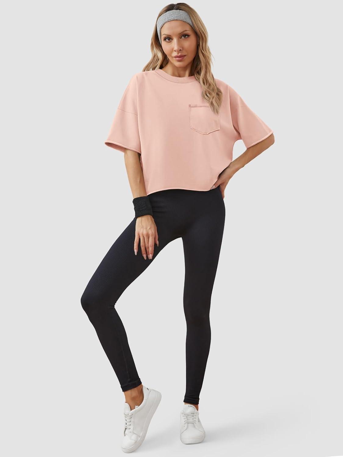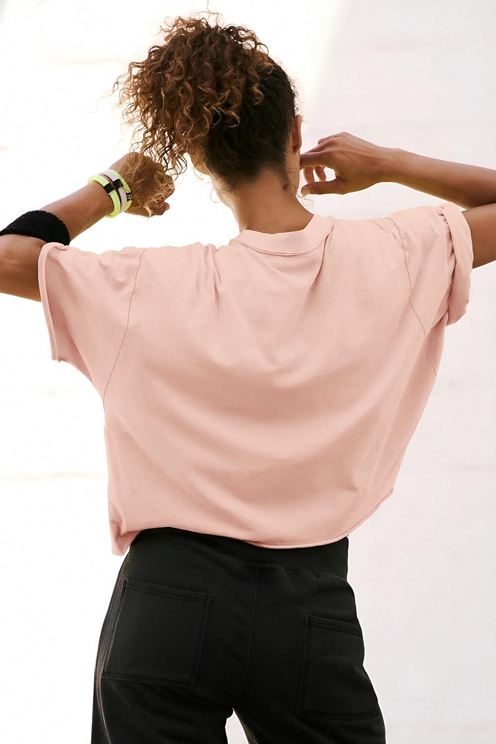 ATHMILE Womens Oversized T-Shirts Short Sleeve Workout Crop Tops Casual Drop Shoulder Boxy Roll Hem Basic Loose Tees(Lightpink)