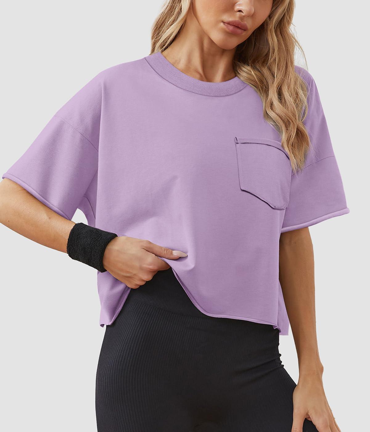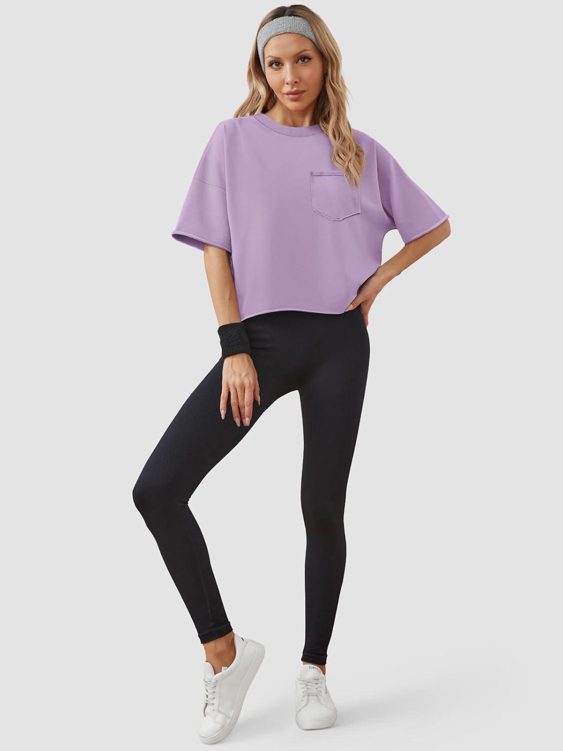 ATHMILE Womens Oversized T-Shirts Short Sleeve Workout Crop Tops Casual Drop Shoulder Boxy Roll Hem Basic Loose Tees(Purple)