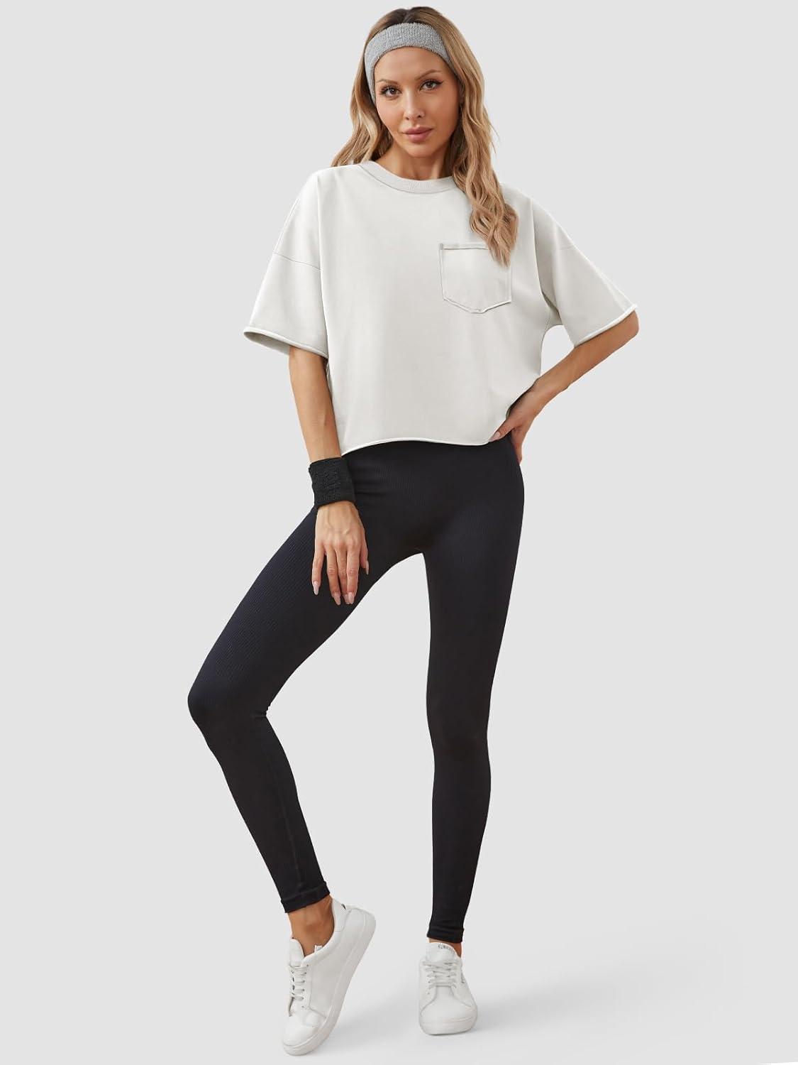 ATHMILE Womens Oversized T-Shirts Short Sleeve Workout Crop Tops Casual Drop Shoulder Boxy Roll Hem Basic Loose Tees(White)