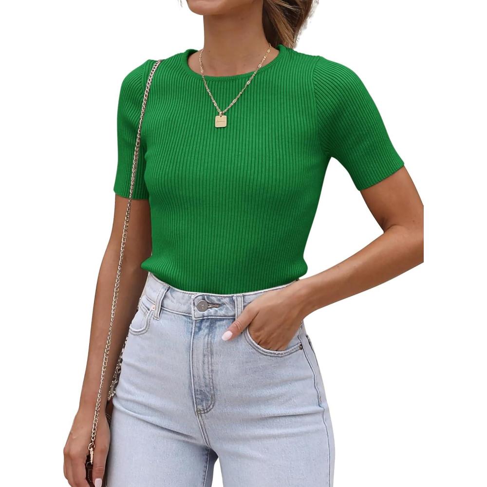 ATHMILE Womens Ribbed Knit T Shirt Casual Crewneck Tops Short Sleeve/Long Sleeve Sweaters Slim Fit Basic Tees(Lucky Green-short Sleeve)