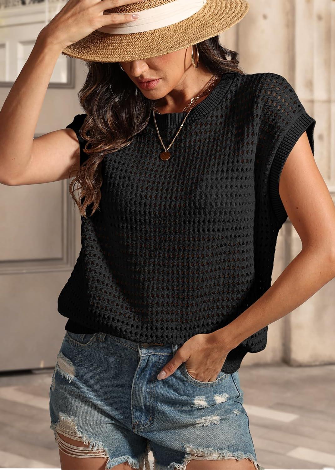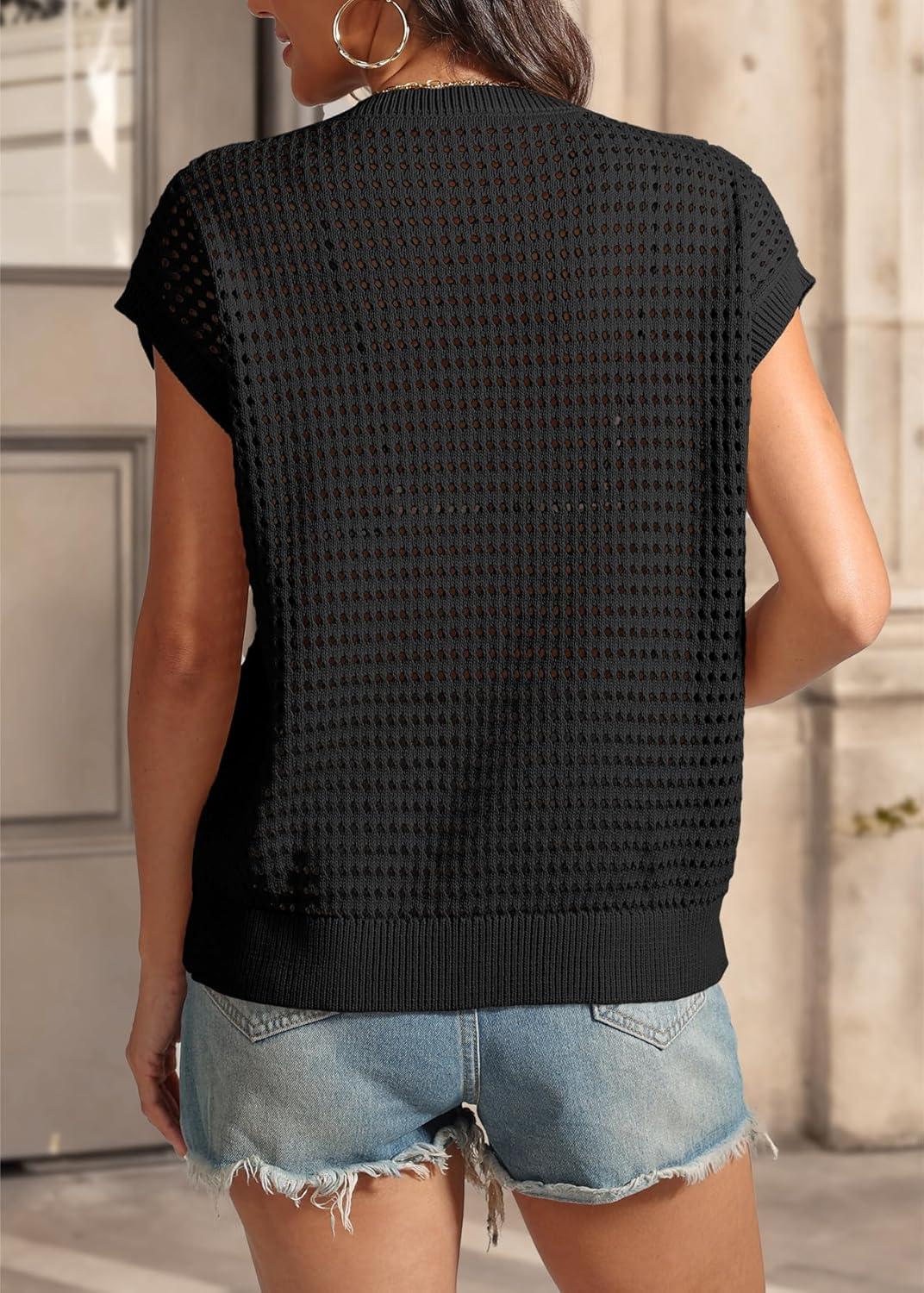 ATHMILE Womens Spring Tops Summer Shirts Beach Vacation Crochet Cap Sleeve Knit Sweater Pullover Cute Fashion Clothes(Black)