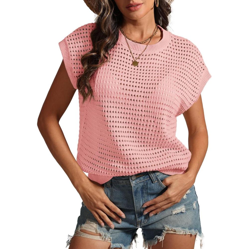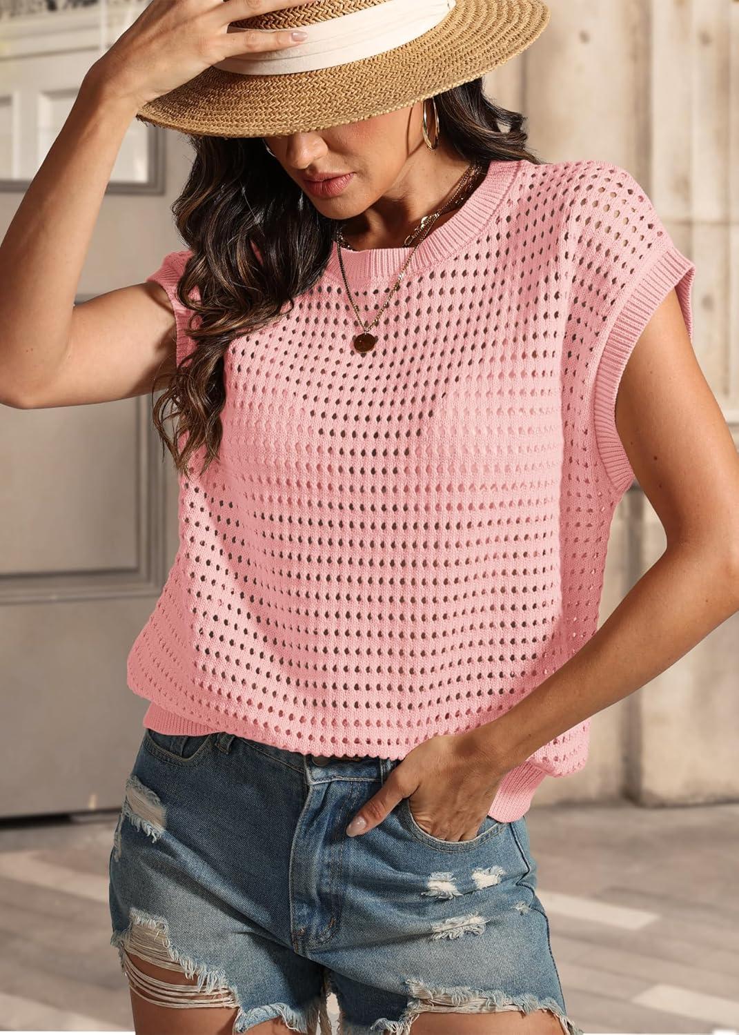 ATHMILE Womens Spring Tops Summer Shirts Beach Vacation Crochet Cap Sleeve Knit Sweater Pullover Cute Fashion Clothes(Pink)