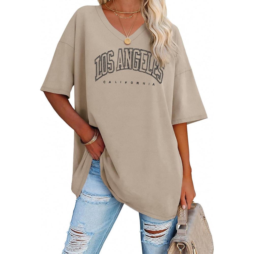 ATHMILE Womens Summer Oversized Shirts V Neck Plus Size Spring Workout Tops Beach Vacation 2025 Gym Clothes(Khaki-1)