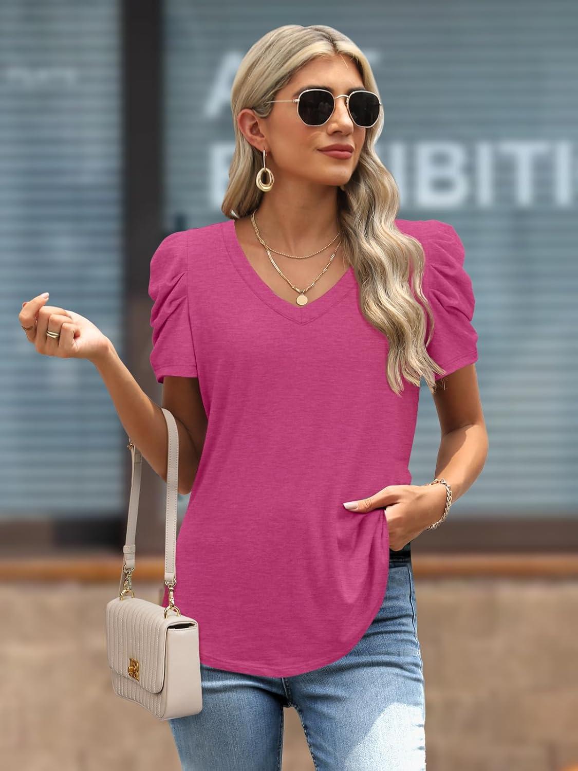 ATHMILE Womens Summer Shirt V Neck Casual Tshirts Puff Sleeve Tops for Women Trendy 2025 Tunic Solid Color(Hot Pink)