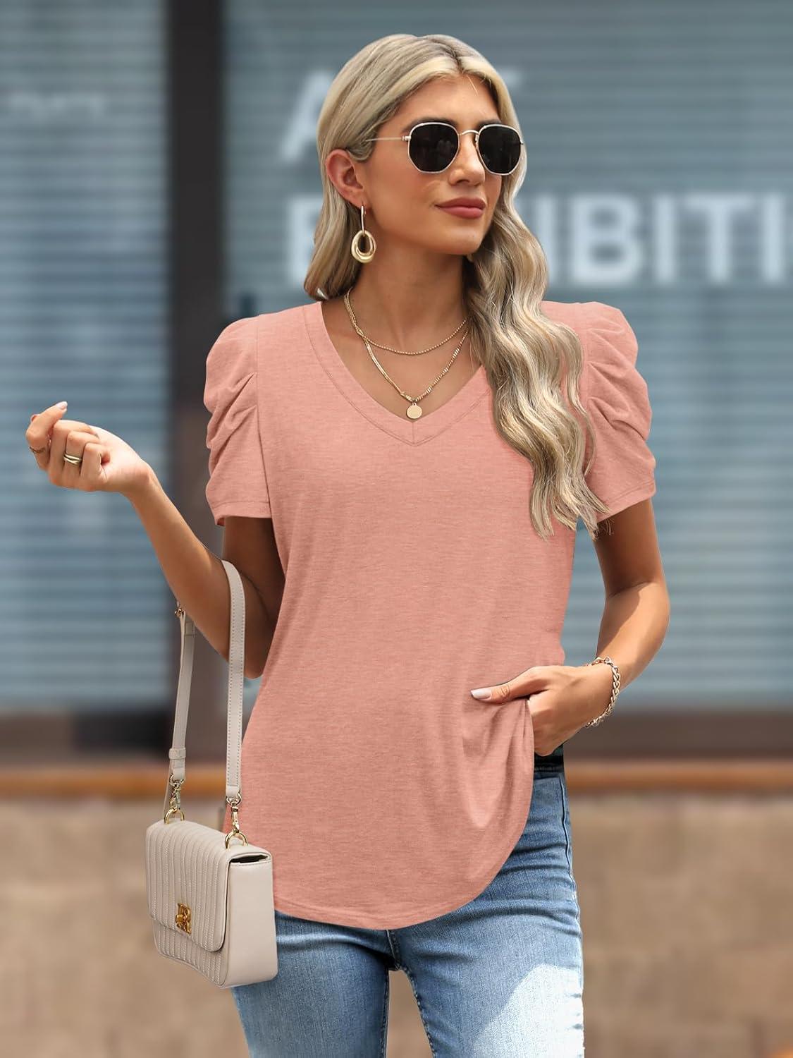 ATHMILE Womens Summer Shirt V Neck Casual Tshirts Puff Sleeve Tops for Women Trendy 2025 Tunic Solid Color(Pink)