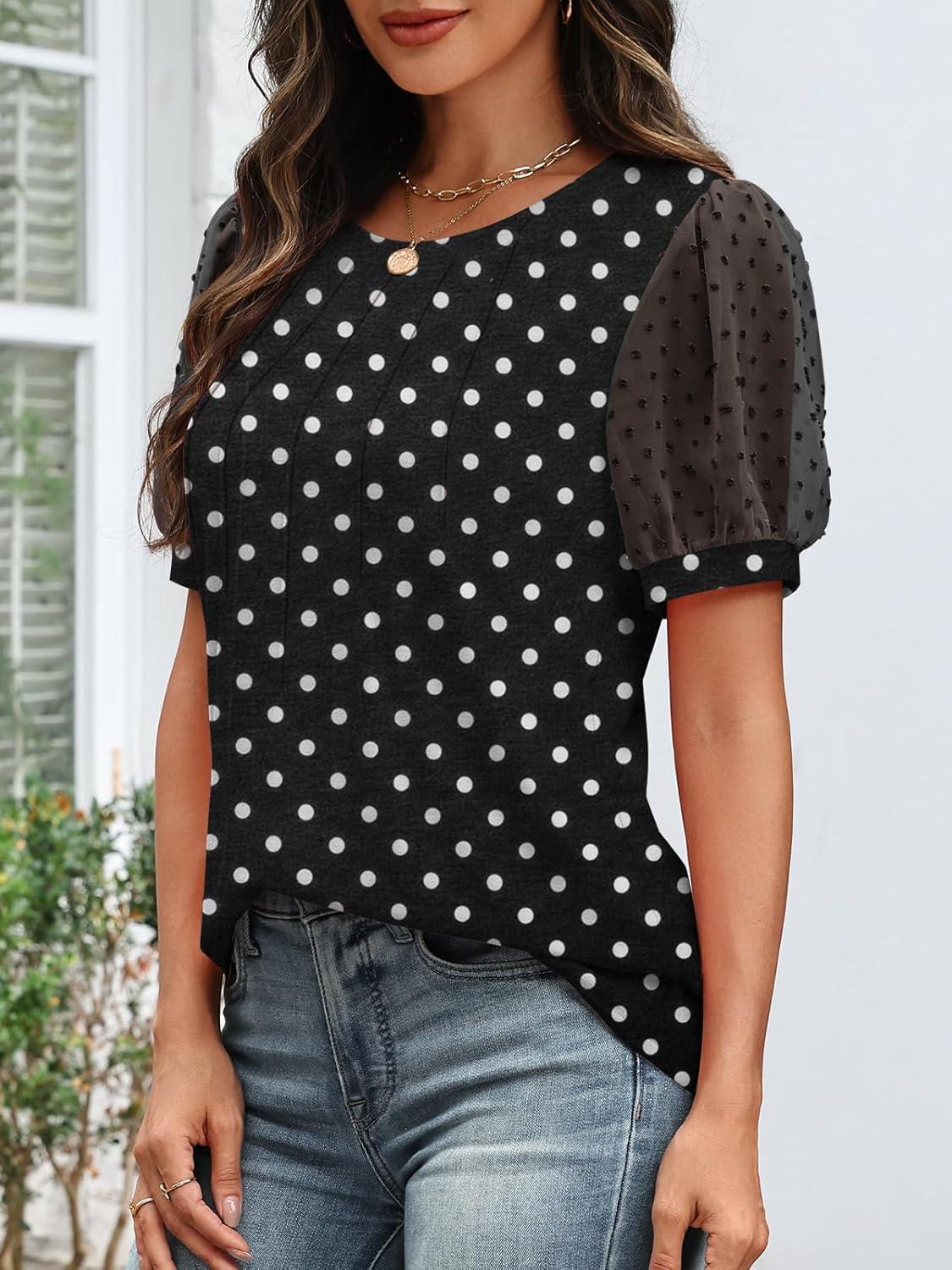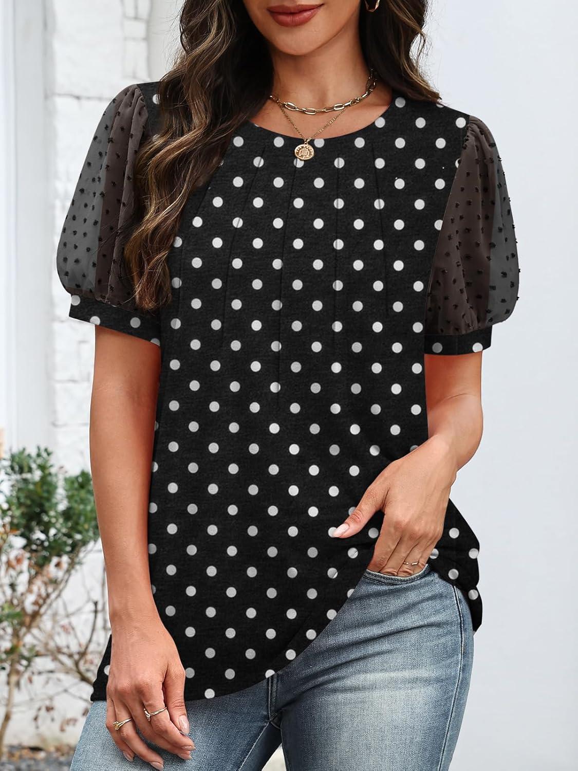 ATHMILE Womens Summer Tops Pleated Crew Neck T Shirts Swiss Dot Puff Sleeve Loose Casual Blouses Trendy Date Outfits(Polka Dots)