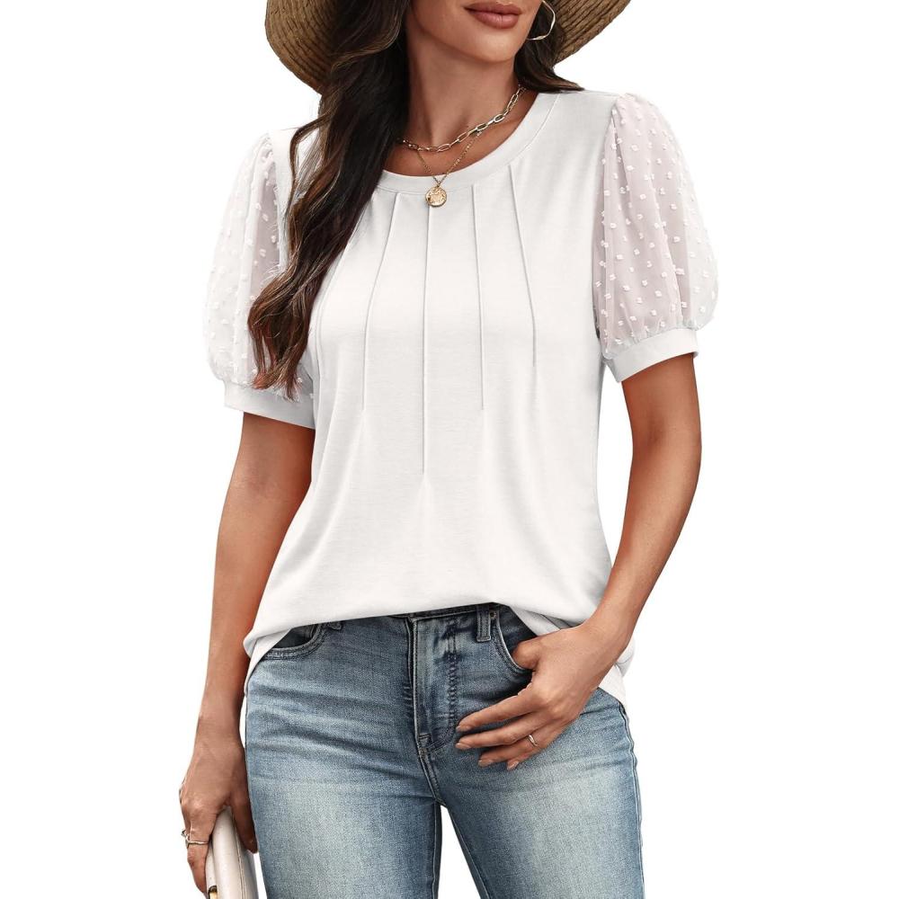 ATHMILE Womens Summer Tops Pleated Crew Neck T Shirts Swiss Dot Puff Sleeve Loose Casual Blouses Trendy Date Outfits(White)
