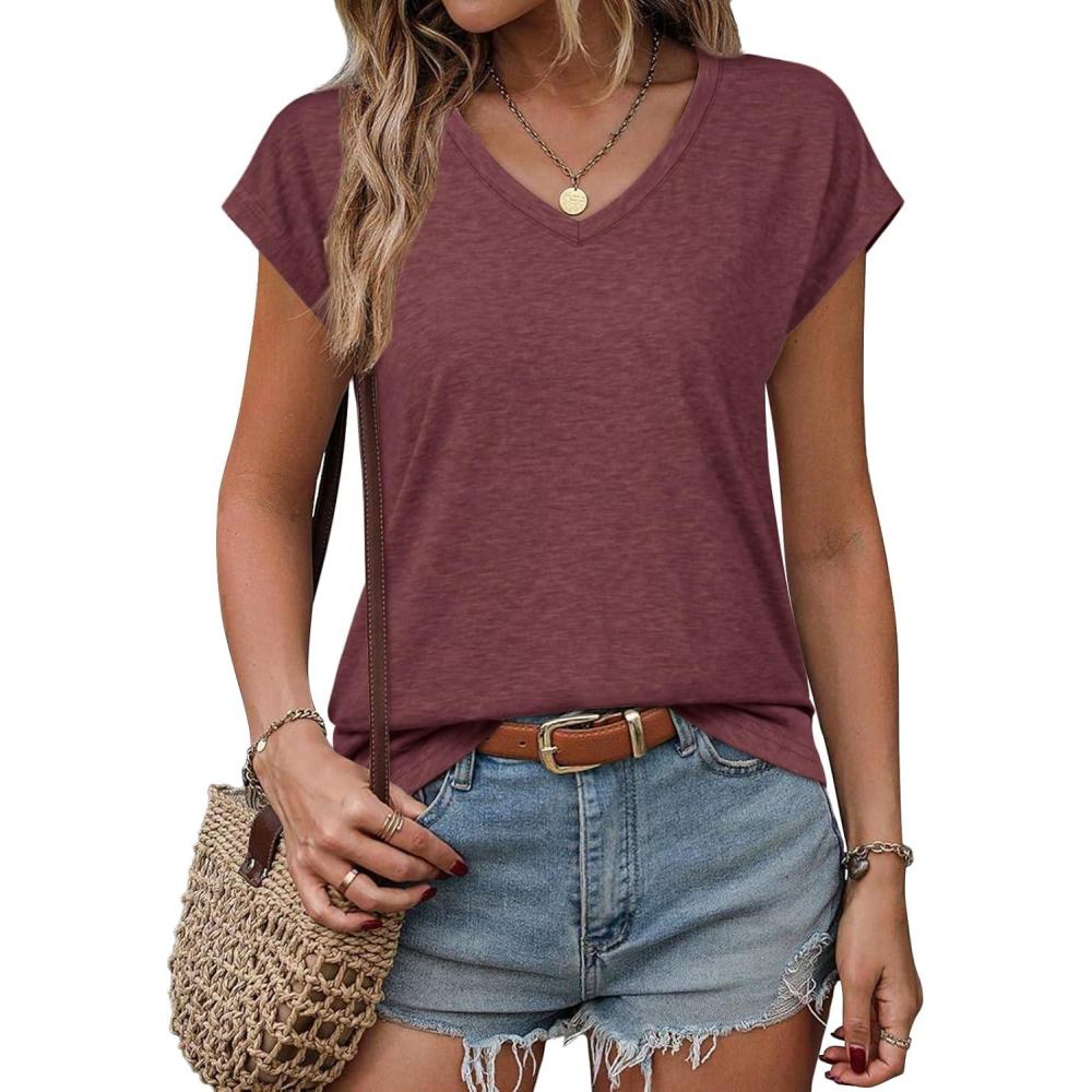 ATHMILE Womens Summer Tops V Neck Cap Sleeve Tshirts Casual Cute T Shirts Fashion Clothes Vintage Basics Tee(Wine Red)