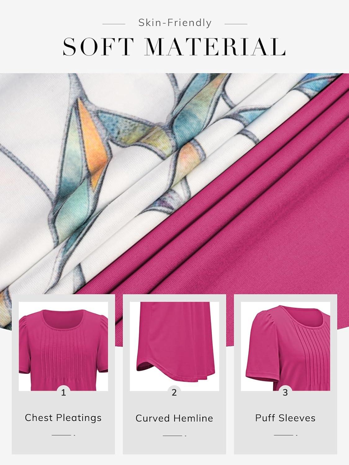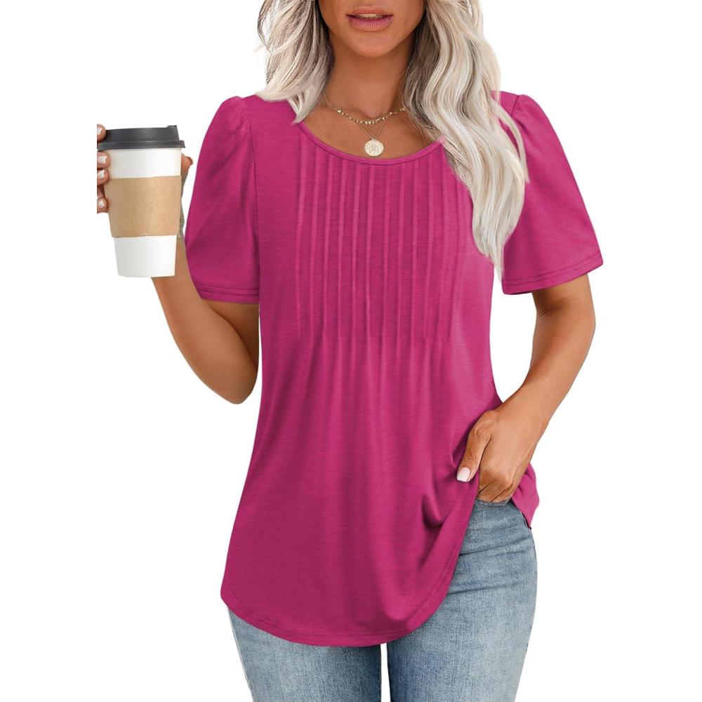 ATHMILE Womens T Shirts Short Sleeve Summer Tops Pleated Dressy Casual Blouses Spring Clothes Beach Vacation 2025(Hot Pink)