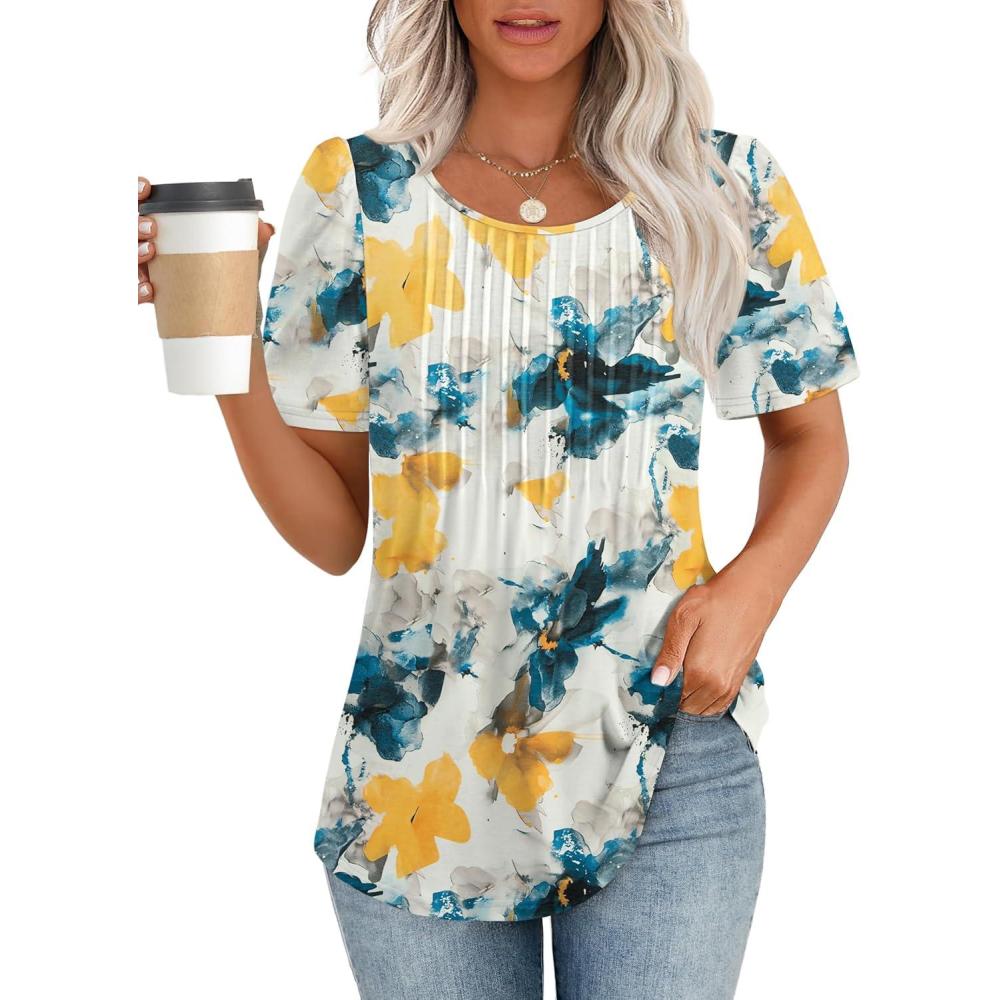 ATHMILE Womens T Shirts Short Sleeve Summer Tops Pleated Dressy Casual Blouses Spring Clothes Beach Vacation 2025(Multileaf)