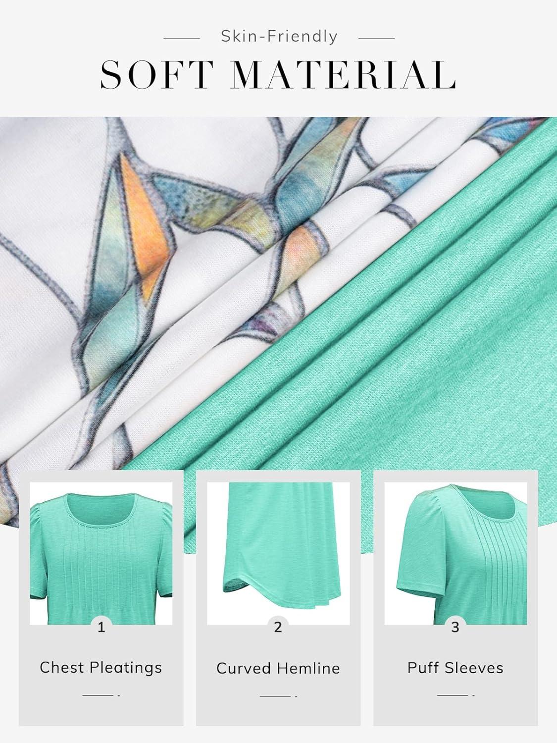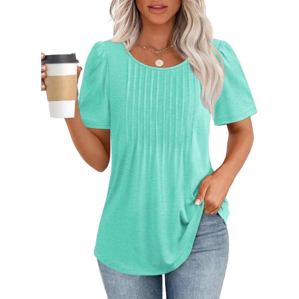 ATHMILE Womens T Shirts Short Sleeve Summer Tops Pleated Dressy Casual Blouses Spring Clothes Beach Vacation 2025(Turquoise)