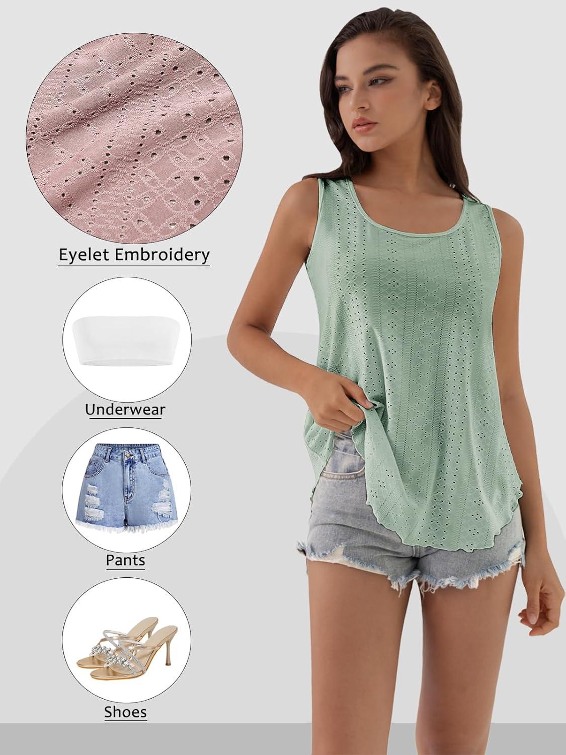 ATHMILE Womens Tank Tops Sleeveless Eyelet Embroidery Scoop Neck Loose Fit Casual Summer Flowy Beach(Green)