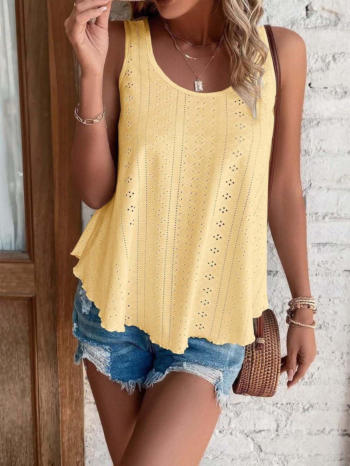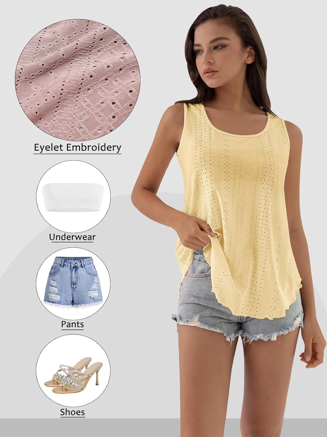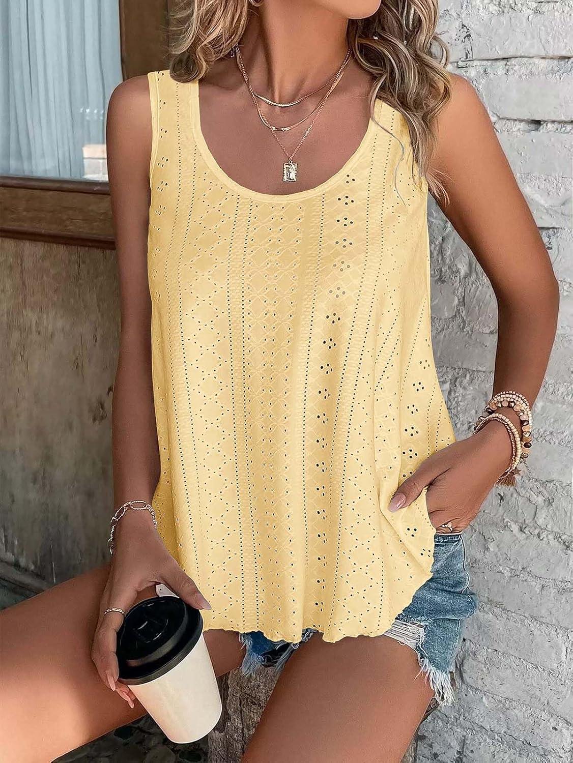ATHMILE Womens Tank Tops Sleeveless Eyelet Embroidery Scoop Neck Loose Fit Casual Summer Flowy Beach(Lightyellow)