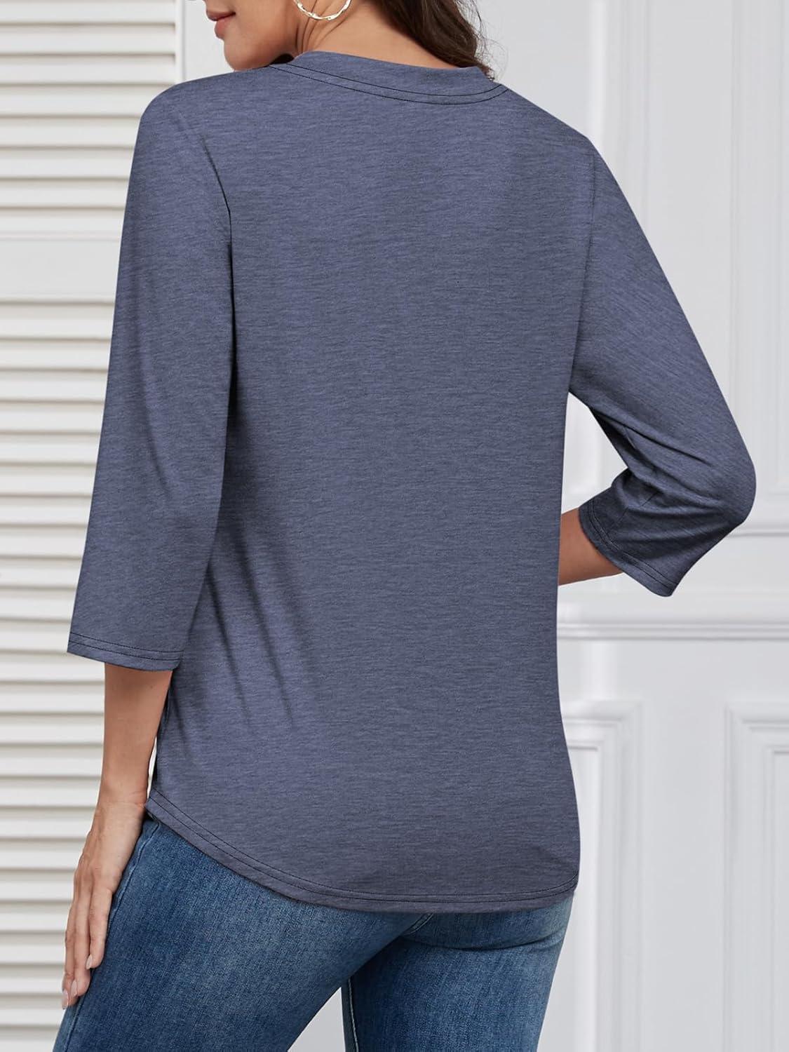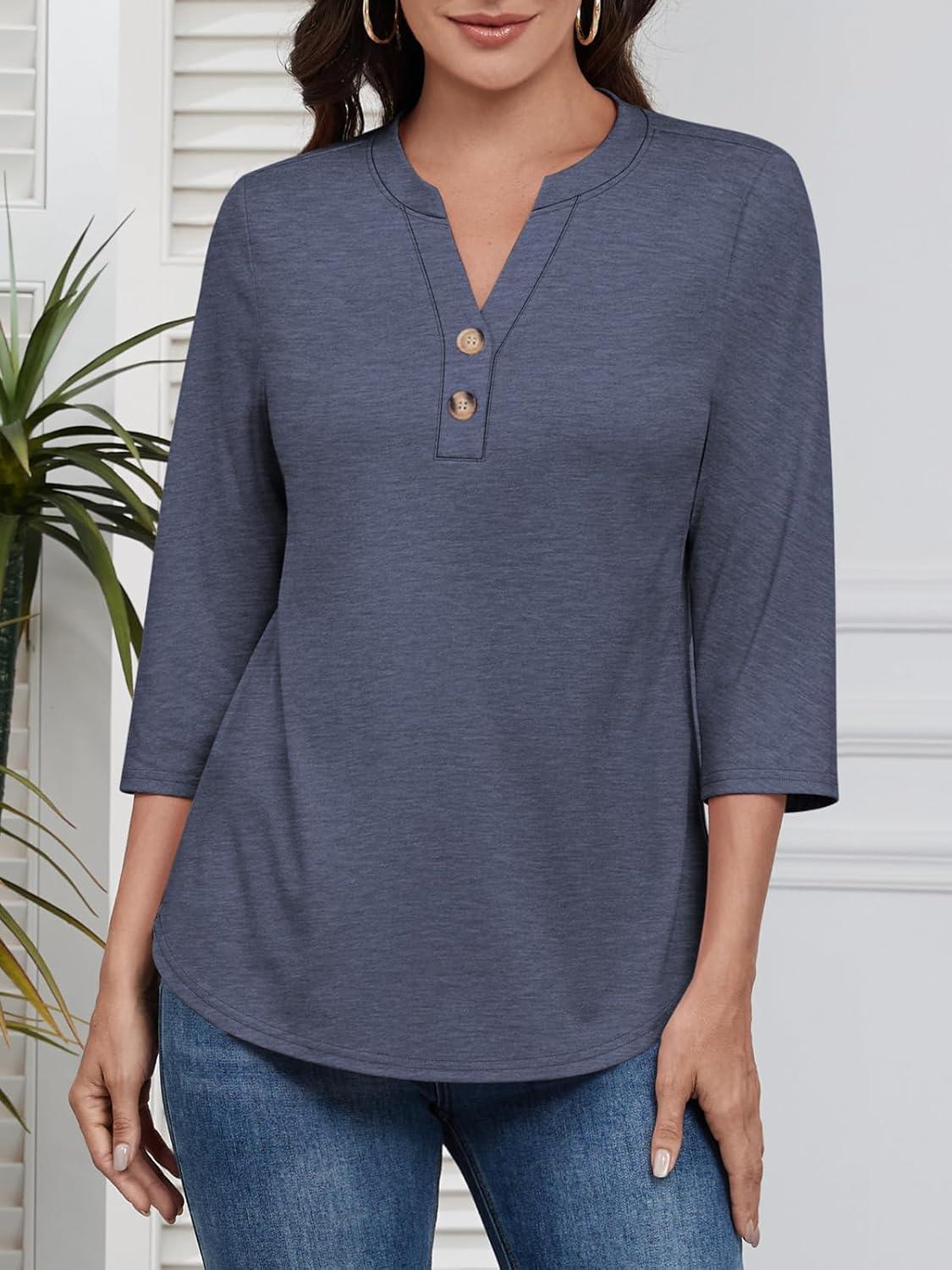 ATHMILE Womens Tops 3/4 Length Sleeve Button Down Henley Shirts Business Casual Outfits Fashion Blouses(Navy Blue)