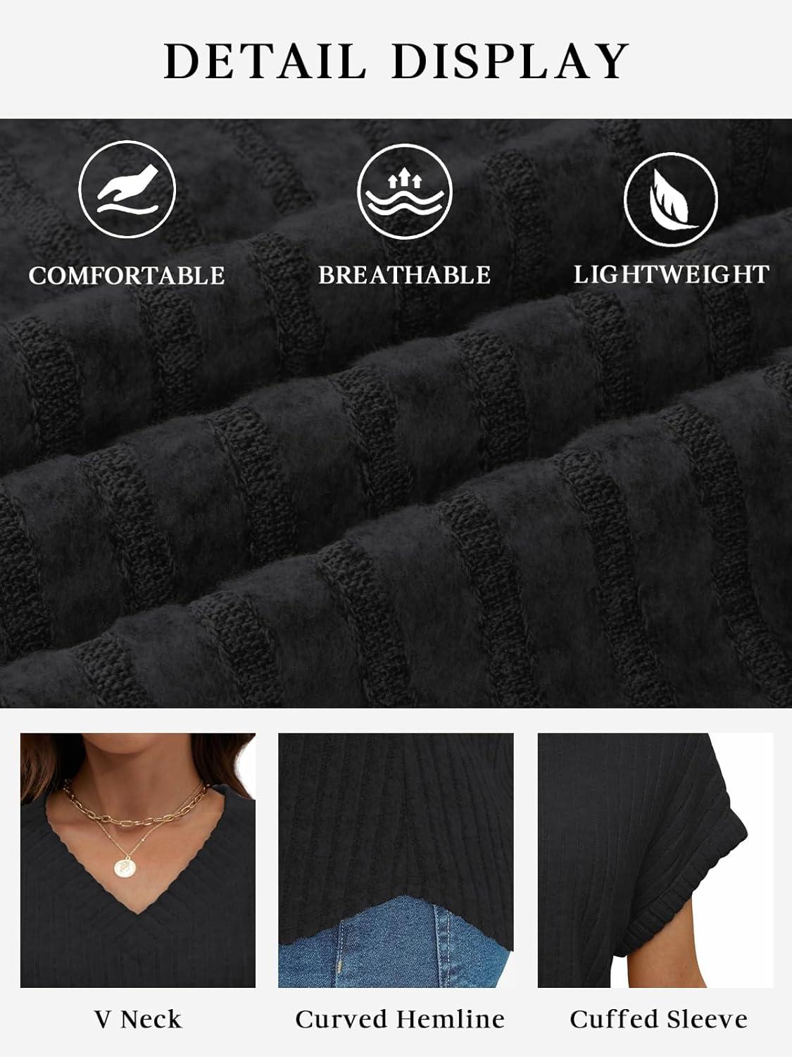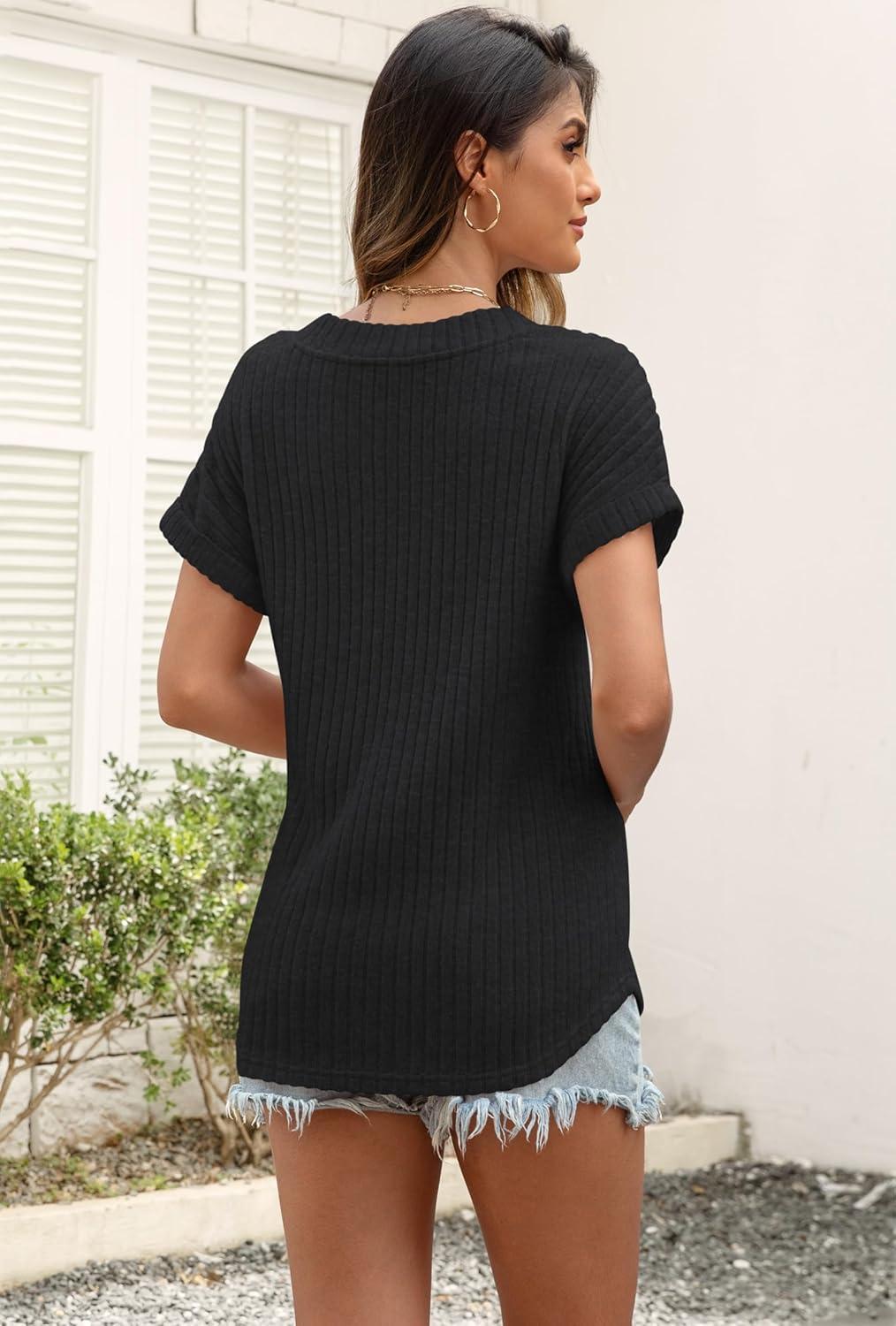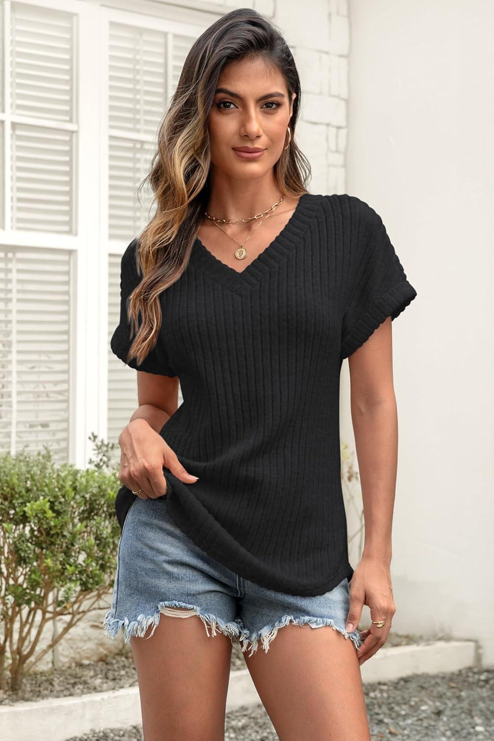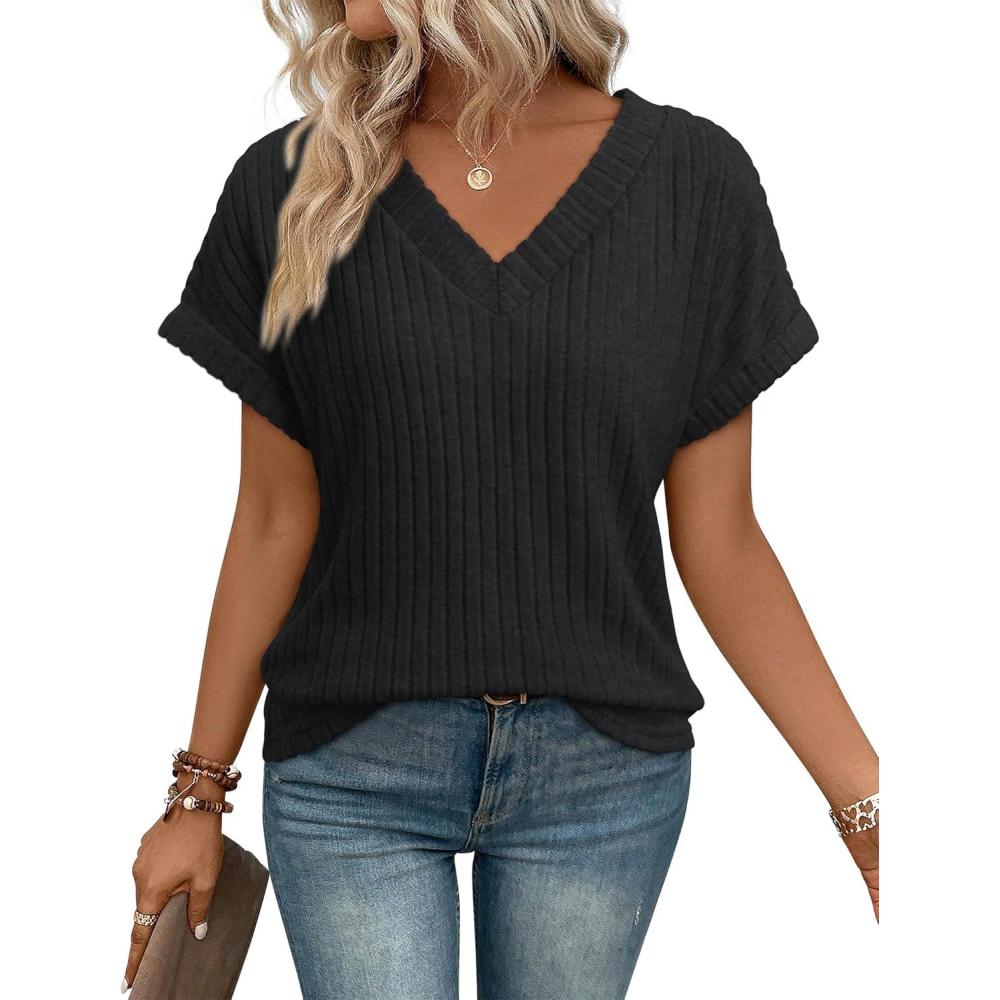 ATHMILE Womens Tops Summer Sweaters V Neck Short Sleeve Shirts Fashion Dressy Casual Business Tunic Blouses(Black)