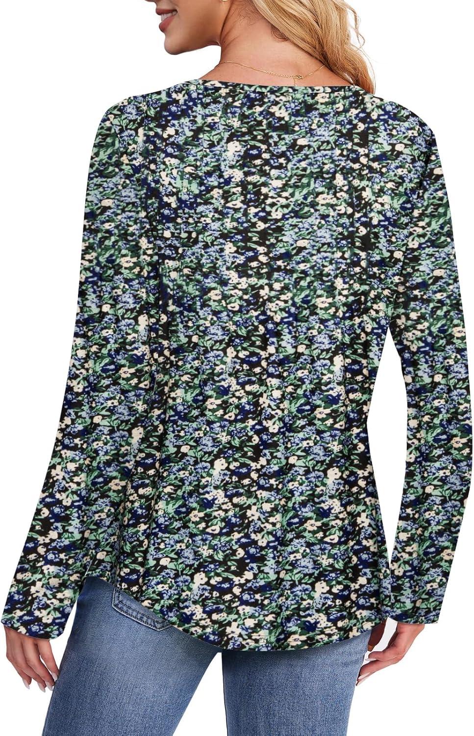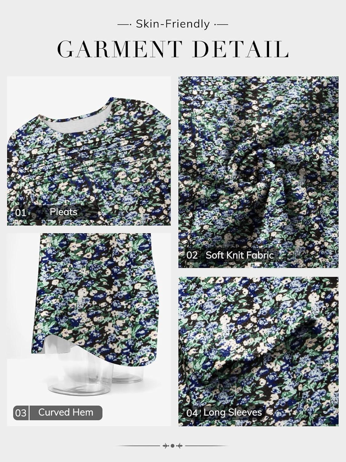ATHMILE Womens Tops Trendy Long Sleeve Shirts for Women Loose Fit Dressy Casual Blouses Pleated Tunic Tops for Leggings(Floral Blue)