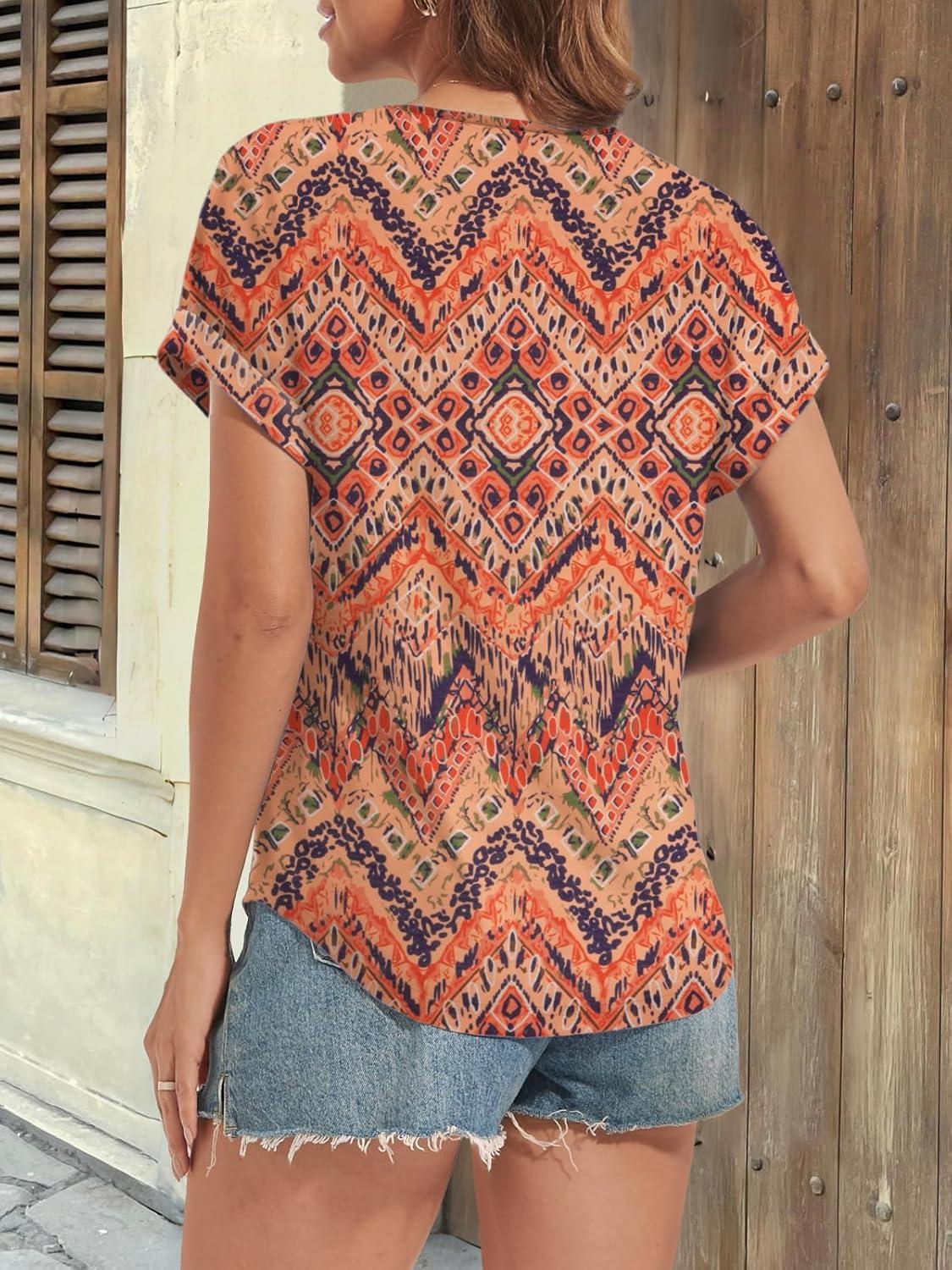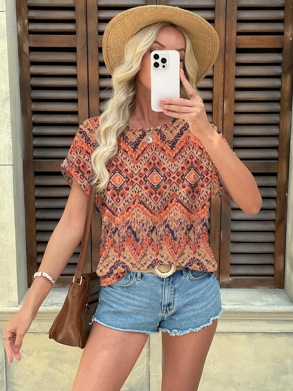 ATHMILE Women's Tunics Loose Fit Dressy Blouses Summer Short Sleeve Tops with Curved Hem Beach Vacation Clothes for Women(Boho)