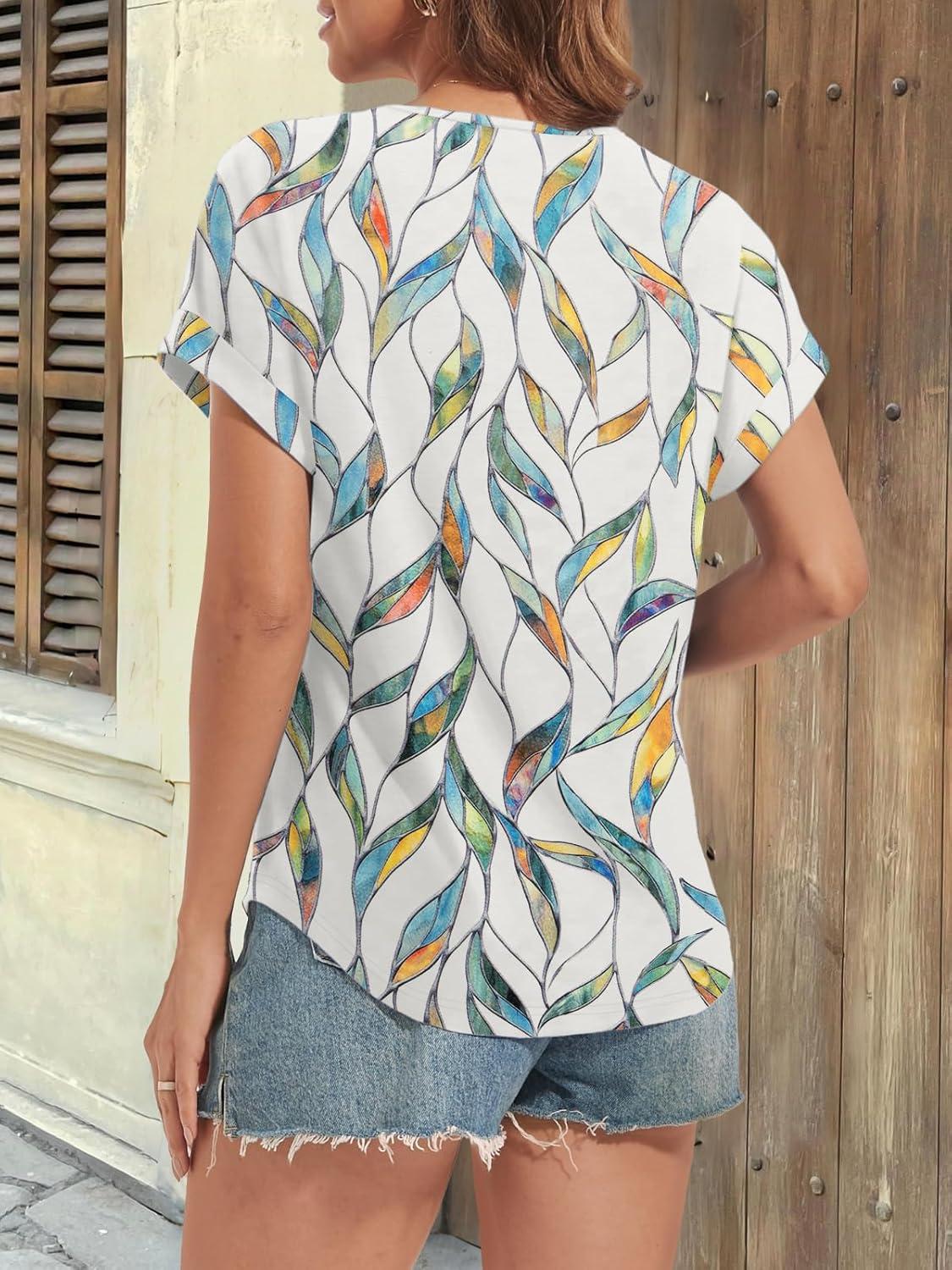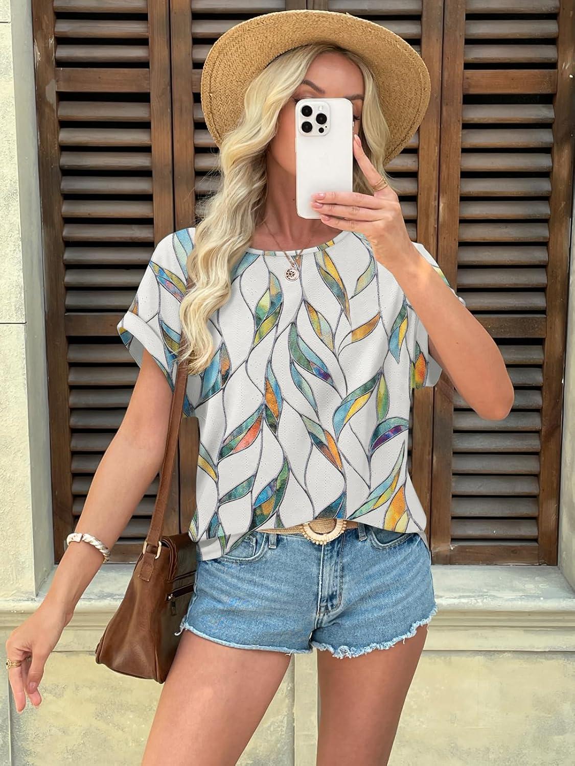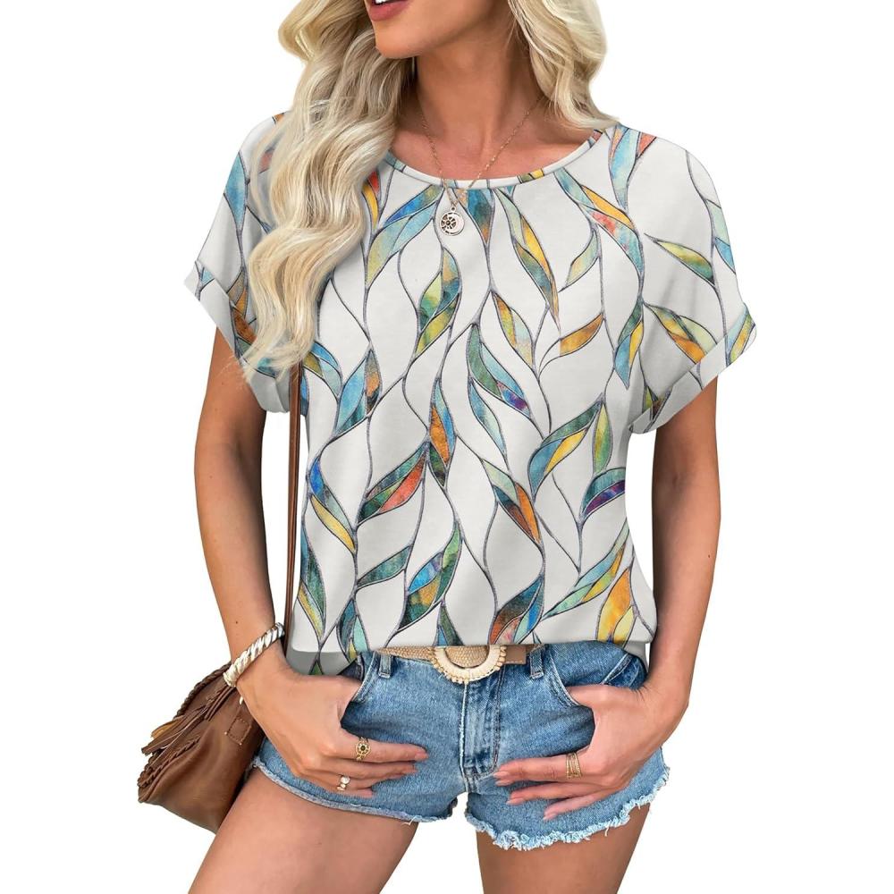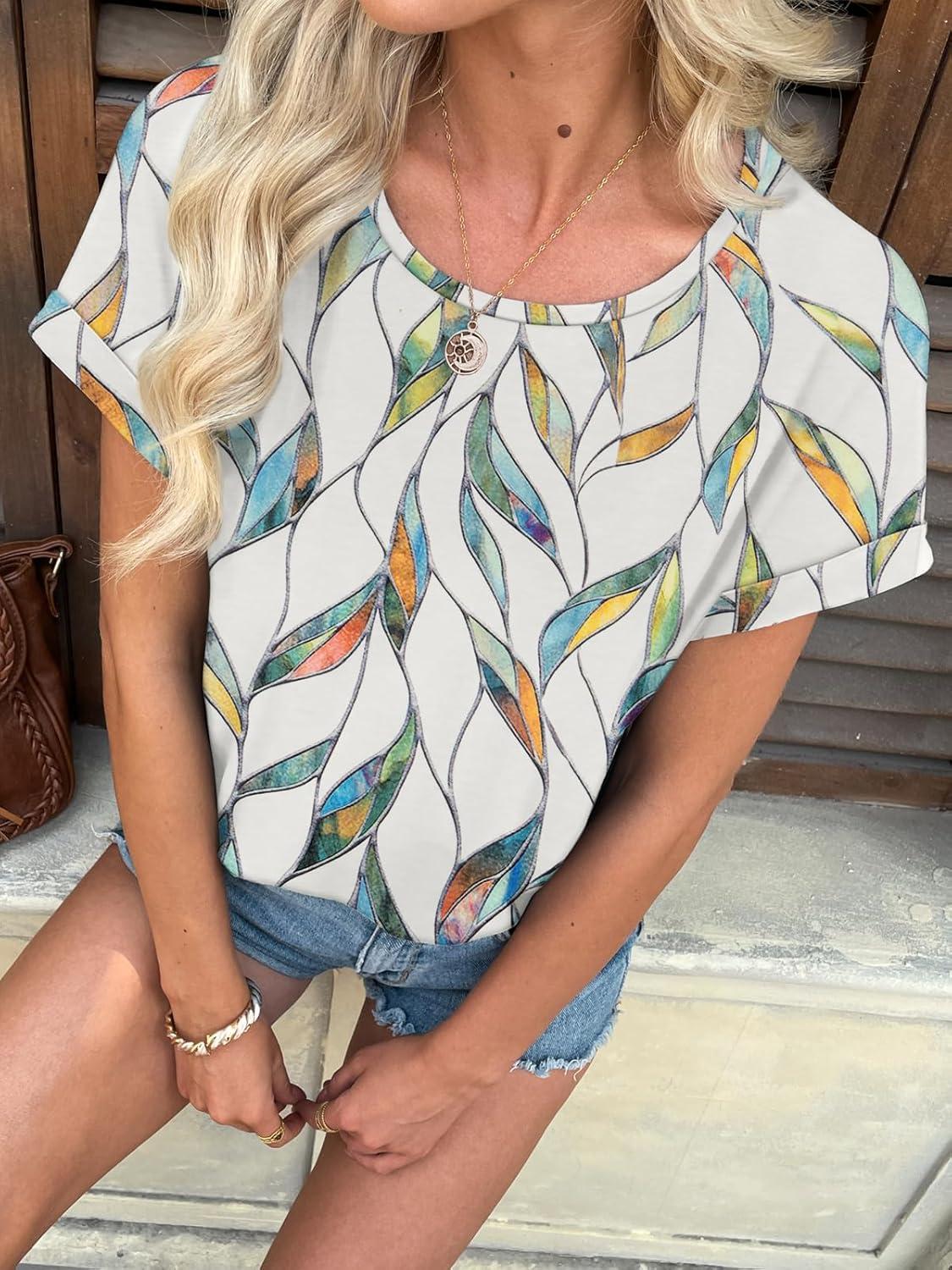 ATHMILE Women's Tunics Loose Fit Dressy Blouses Summer Short Sleeve Tops with Curved Hem Beach Vacation Clothes for Women(Colorful Leaf)