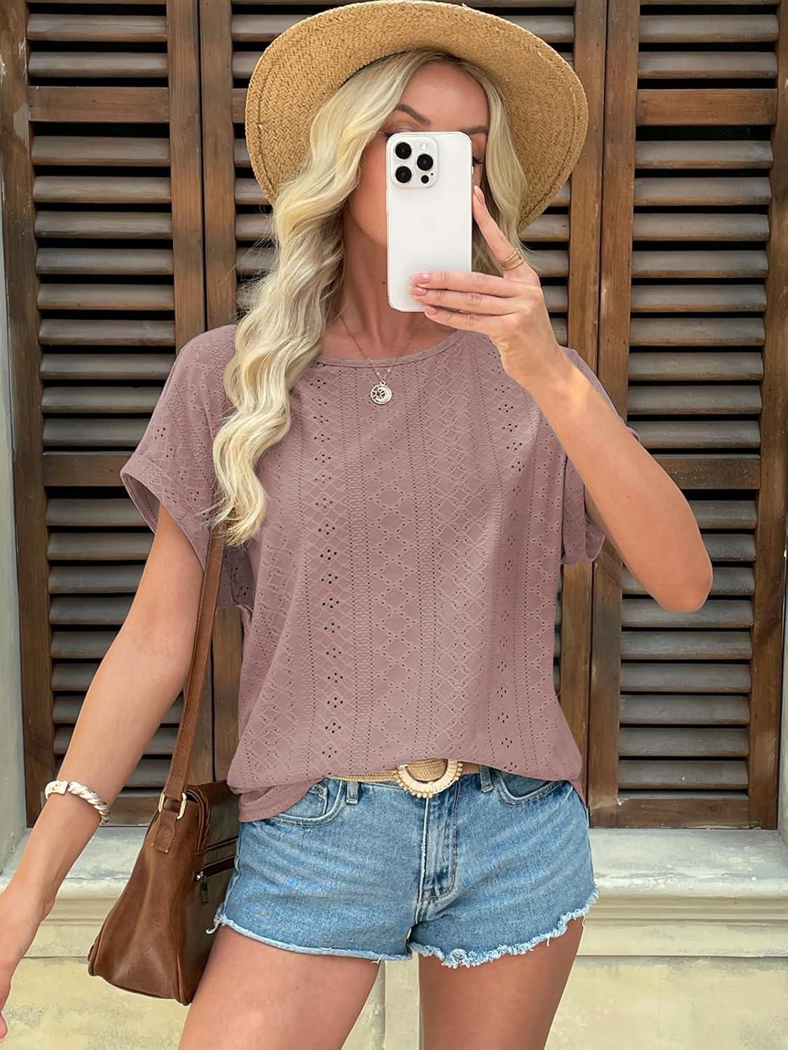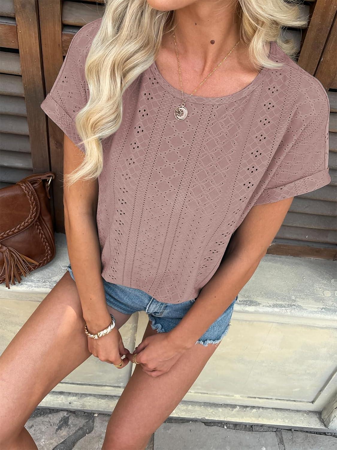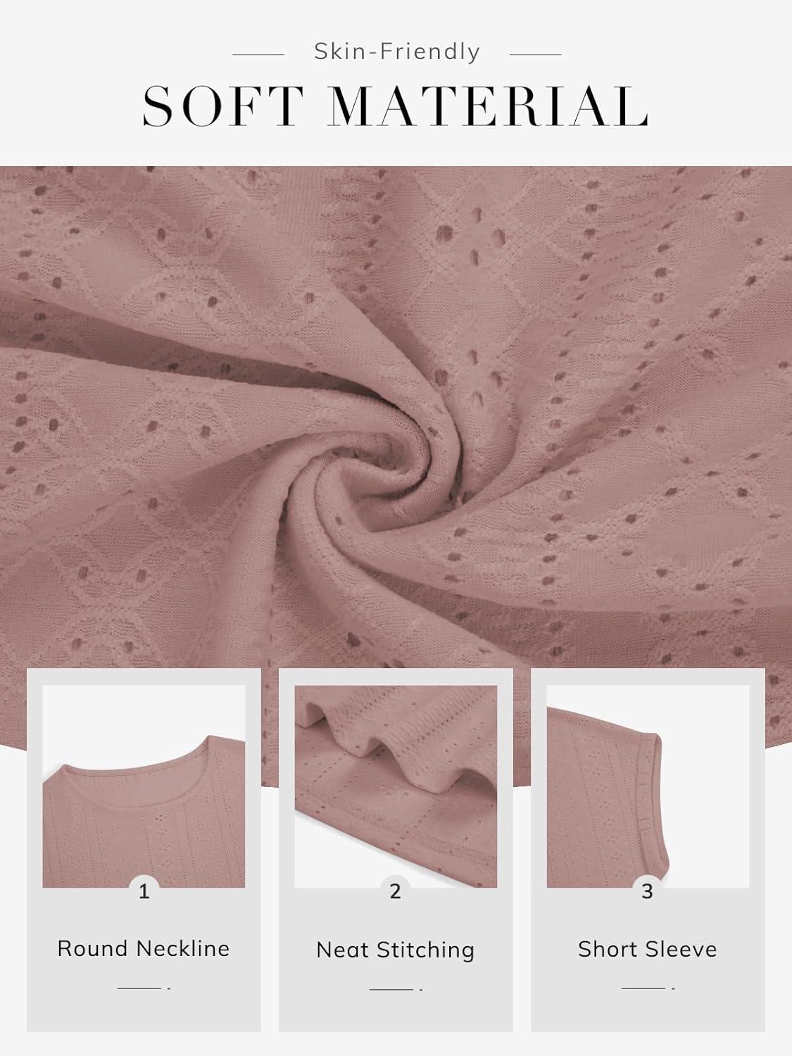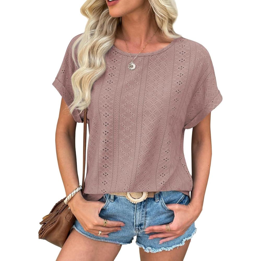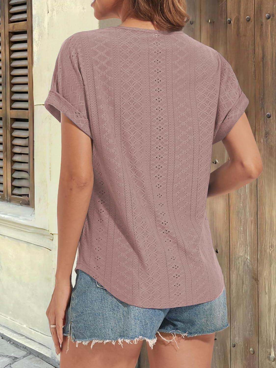 ATHMILE Women’s Tunics Loose Fit Dressy Blouses Summer Short Sleeve Tops with Curved Hem Beach Vacation Clothes for Women(Dark Pink)