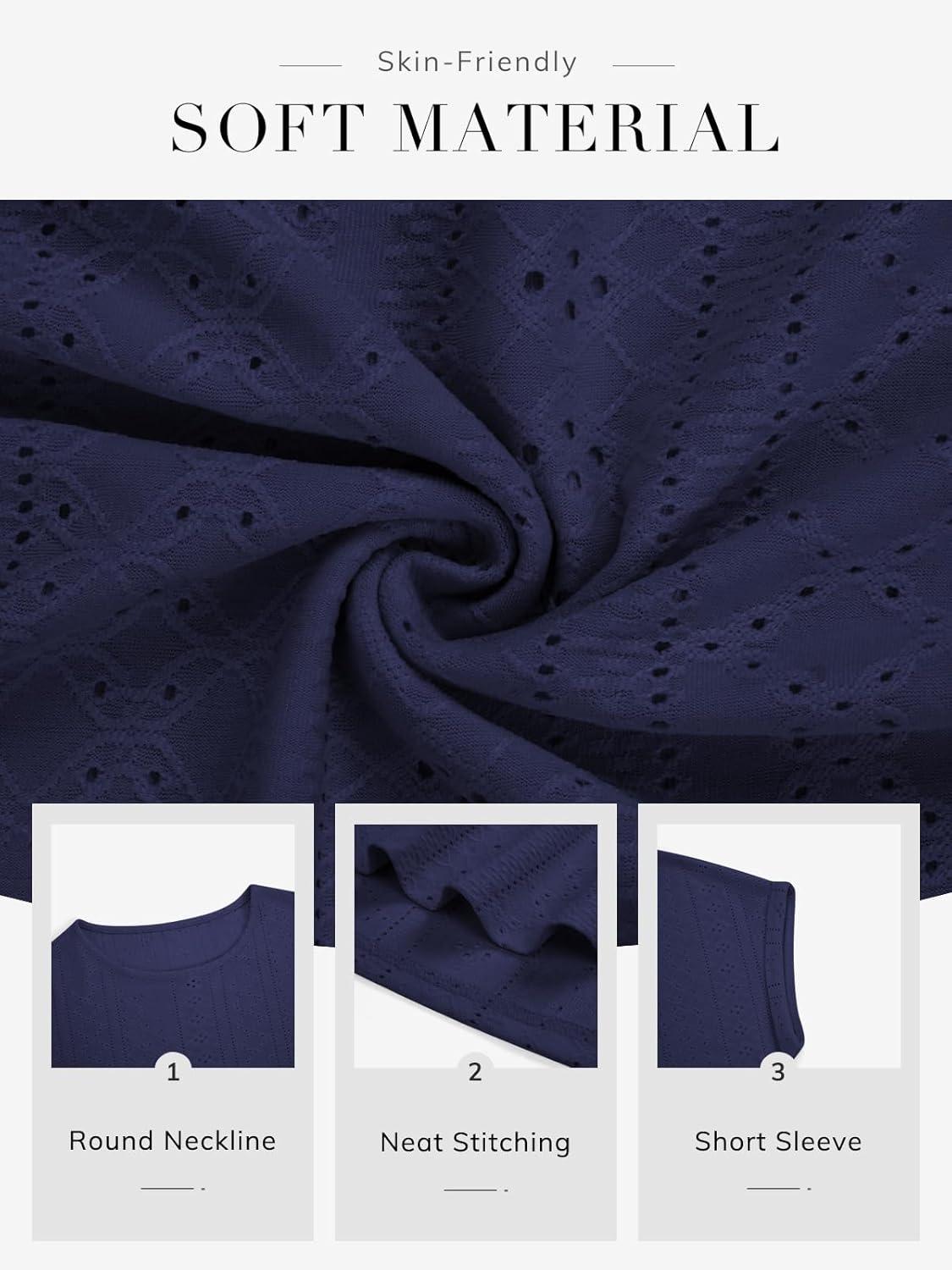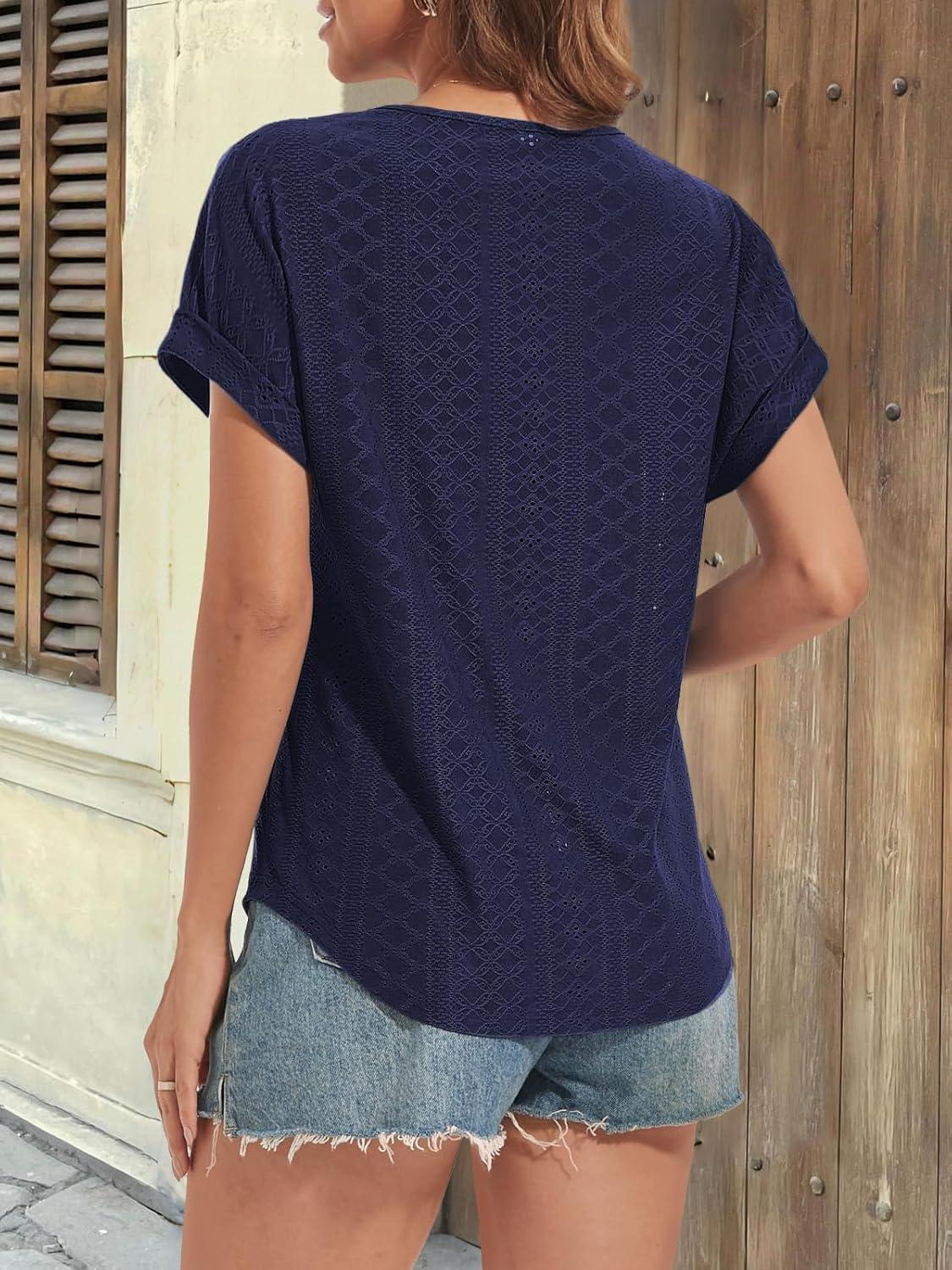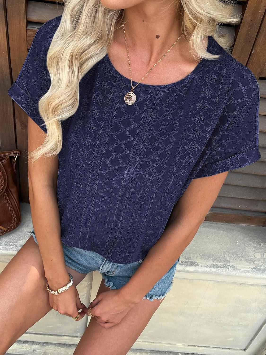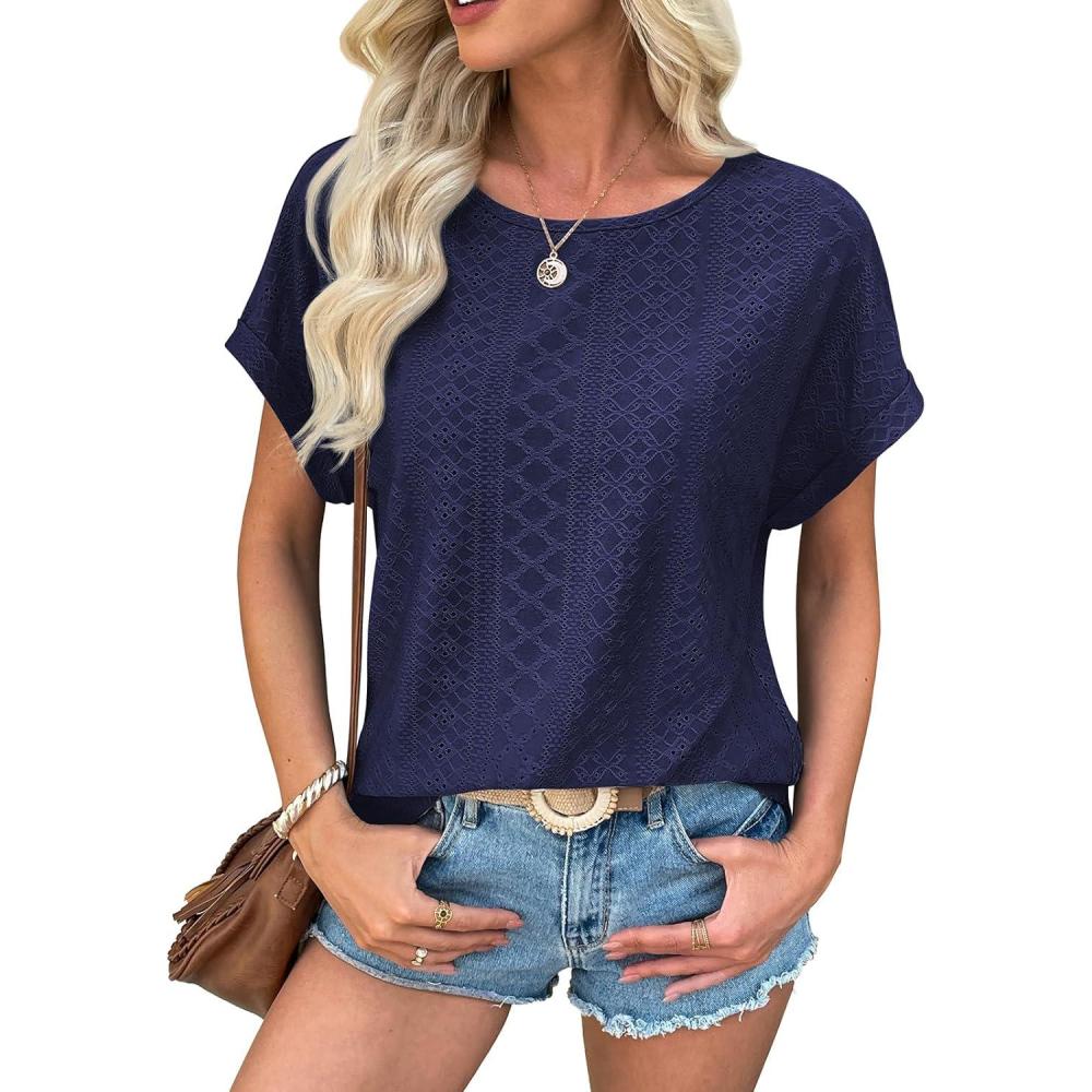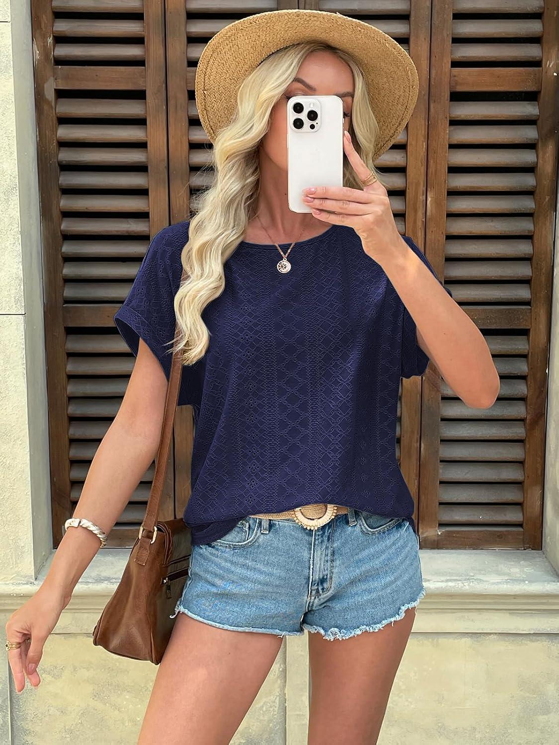 ATHMILE Women's Tunics Loose Fit Dressy Blouses Summer Short Sleeve Tops with Curved Hem Beach Vacation Clothes for Women(Navy Blue)