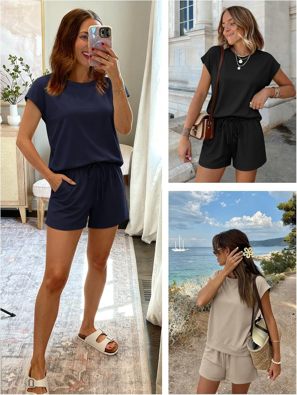 ATHMILE Womens Two Piece Sets Summer Crew Neck Cap Sleeve Tops Lounge Shorts Beach Vacation Rompers Outfits With Pockets
