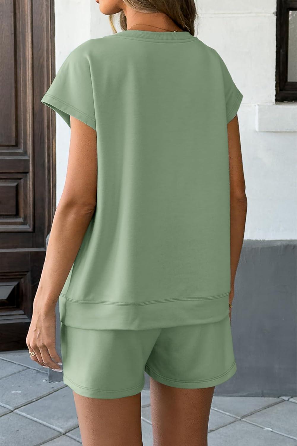 ATHMILE Womens Two Piece Sets Summer Crew Neck Cap Sleeve Tops Lounge Shorts Beach Vacation Rompers Outfits With Pockets