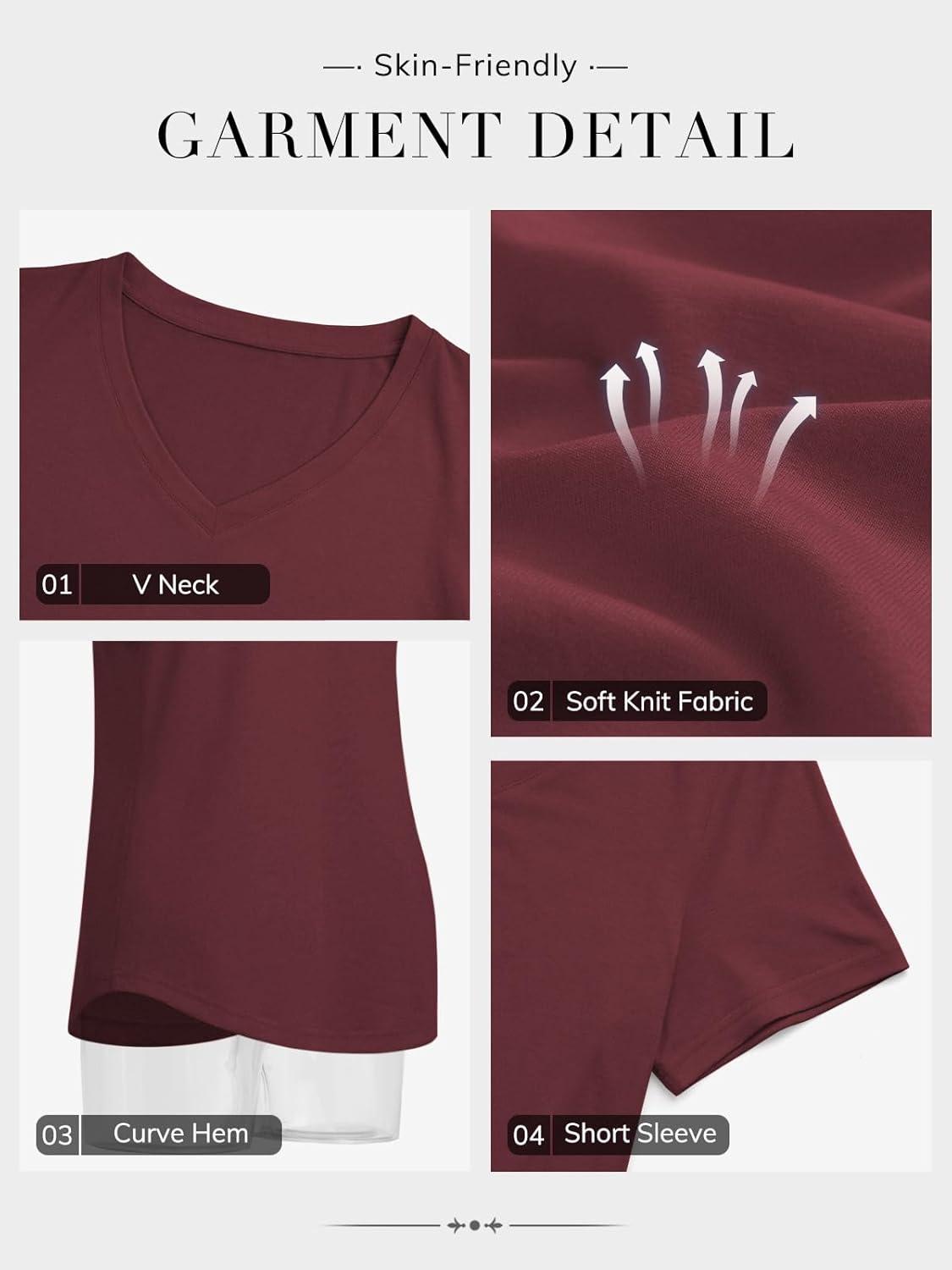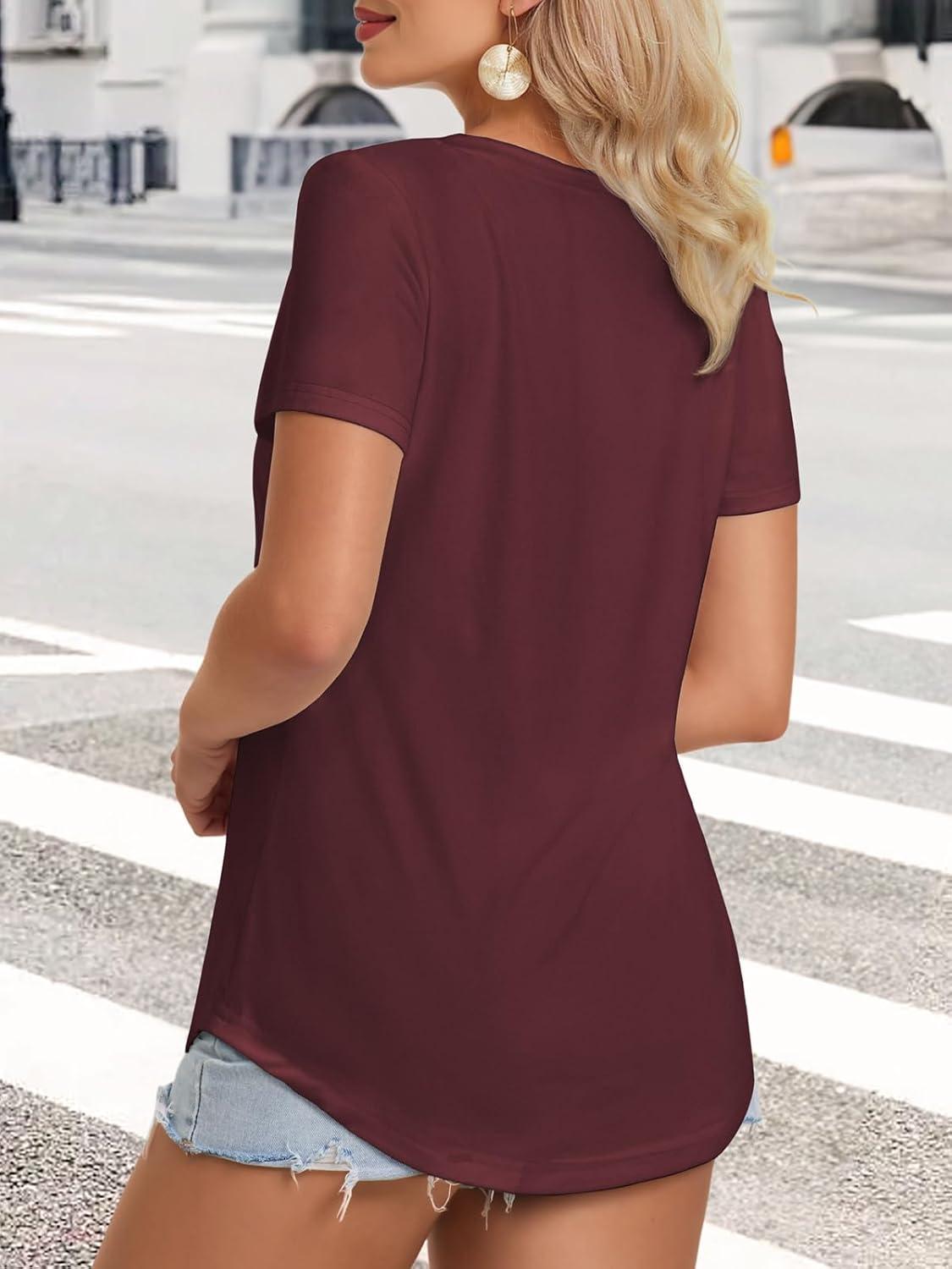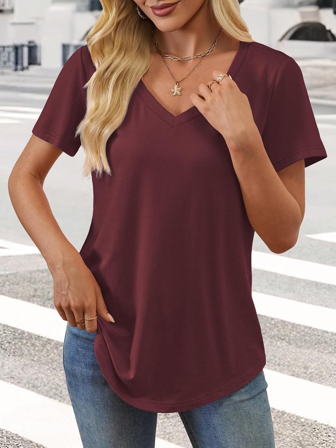 ATHMILE Womens V Neck Short Sleeve Summer T Shirts Curved Hem Plain Top Beach(Winered)